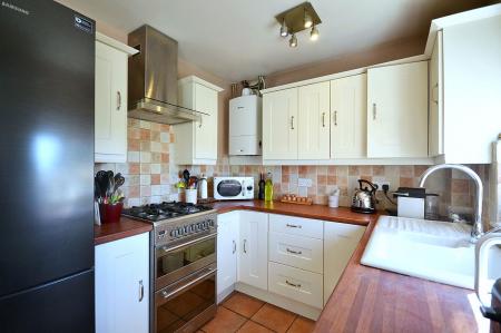 To the rear, the kitchen and dining area forms the sociable heart of the home. Stylishly fitted with a range of base units topped with complementary work surfaces, the kitchen incorporates a sink and drainer alongside a built-in gas oven, hob and extractor. There is space and plumbing for a dishwasher and washing machine, as well as room for a freestanding fridge/freezer. Tiled flooring and a rear-facing window allow for plenty of natural light, while a door opens directly onto the garden — ideal for both everyday living and entertaining.