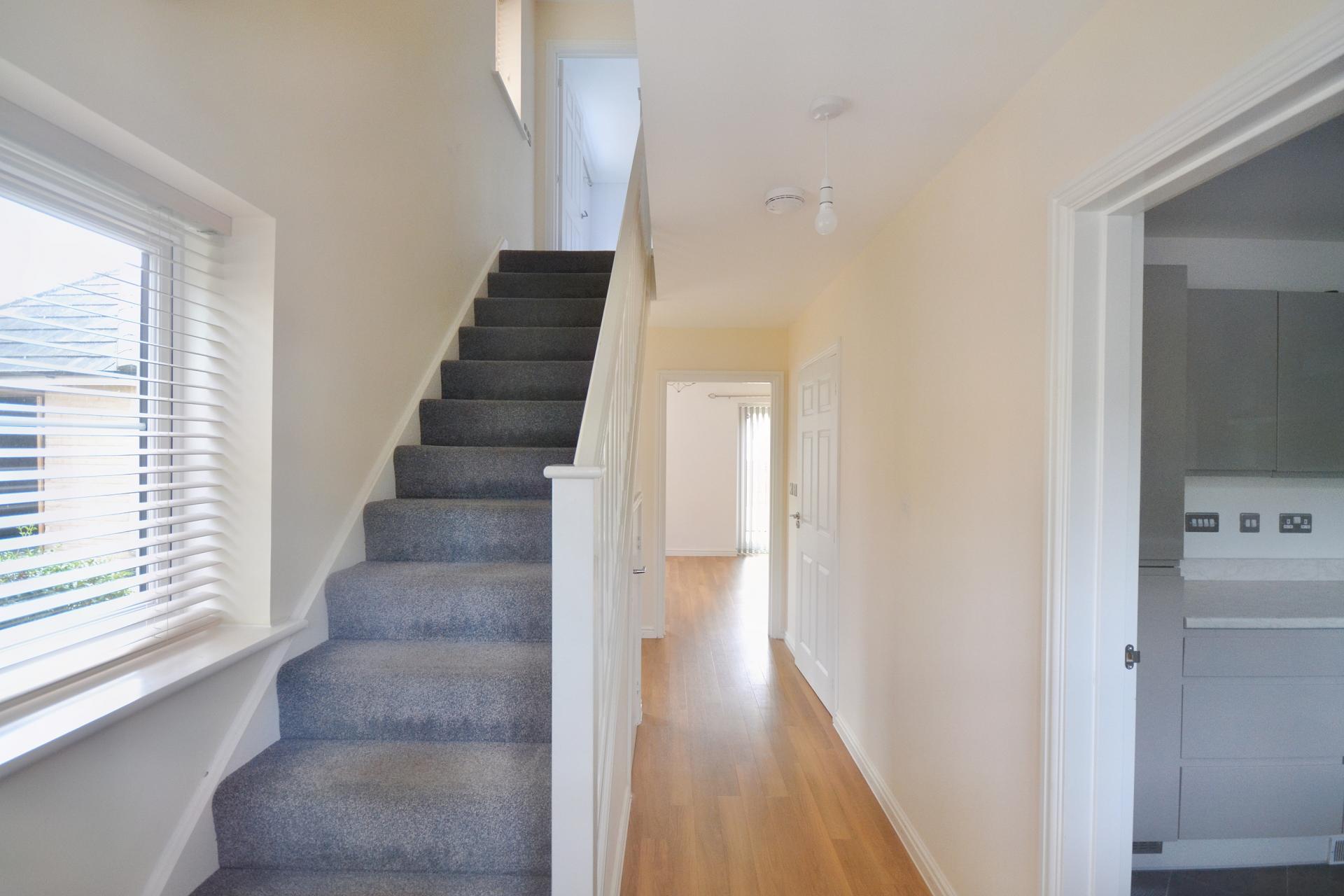 In detail, the property comprises of an entrance hall with window to the side aspect, staircase rising to the first floor and understairs storage cupboard and doors to the adjoining rooms. The cloakroom comprises W.C and wash hand basin. The dual aspect, generous sitting/ dining room benefits from patio doors leading to the rear garden and door to walk-in storage cupboard. The kitchen is fitted with a range of base and eye level units with worksurface over and stainless-steel sink incorporated. Integrated appliances include a four-ring gas hob with overhead extractor fan, electric double oven, fridge/freezer, washing machine and dishwasher. There is a window to the side aspect.
