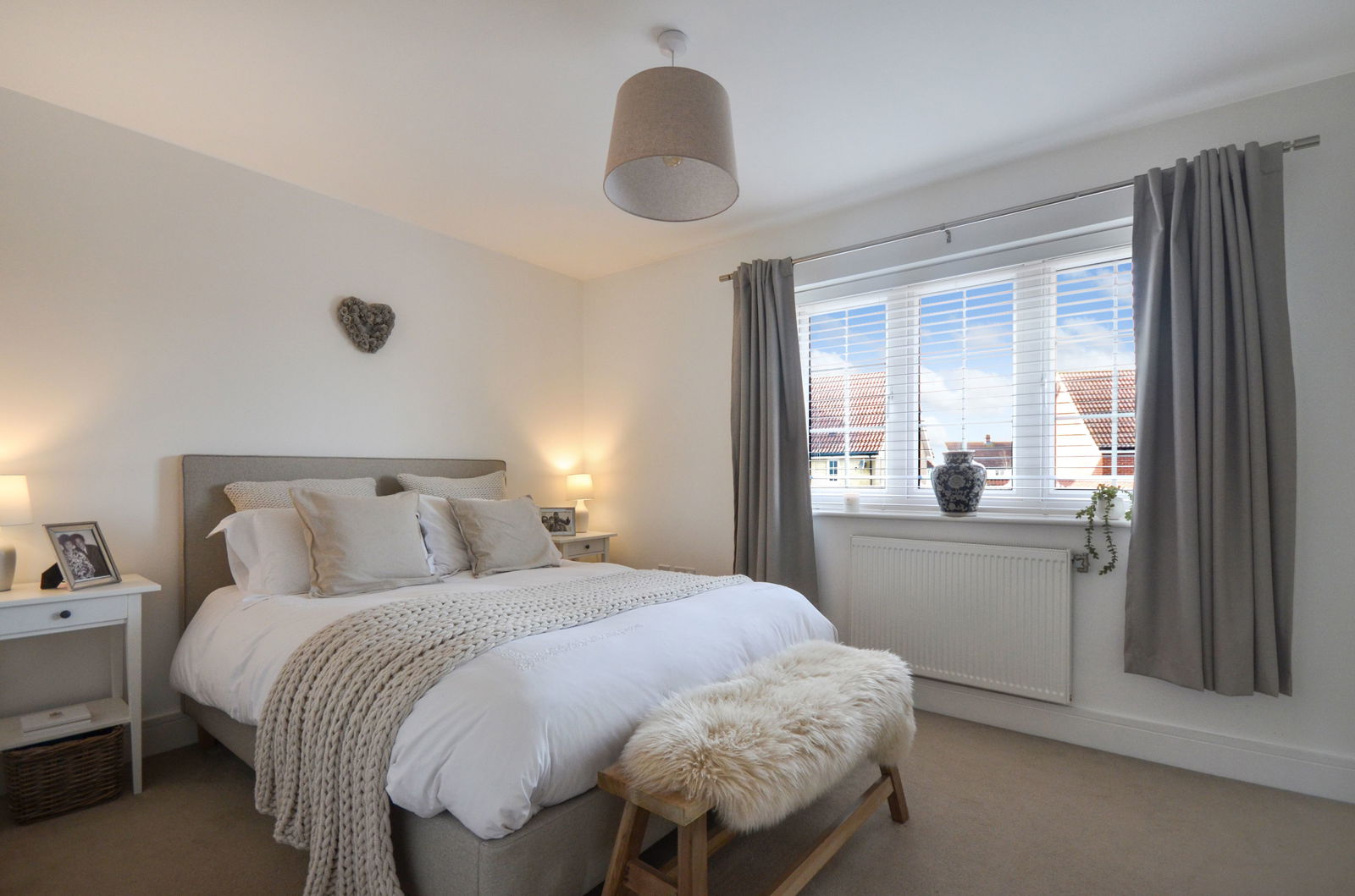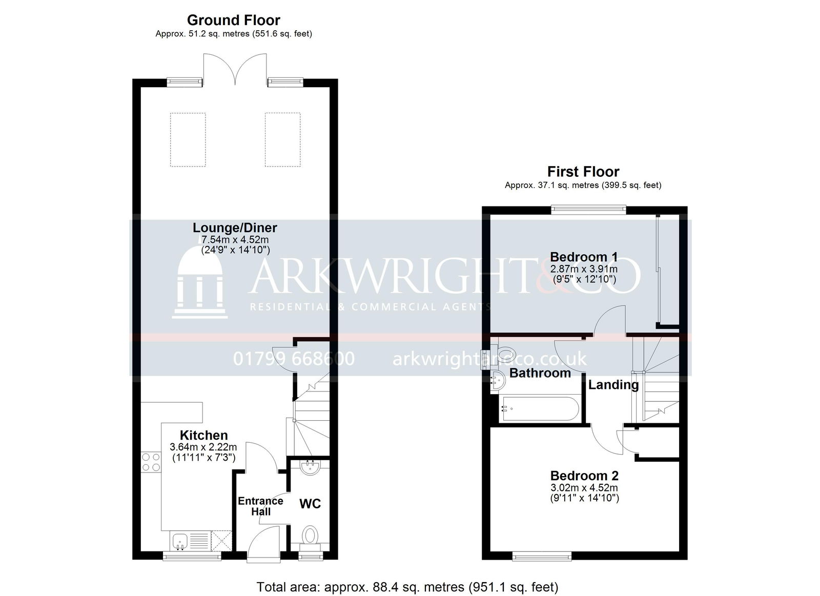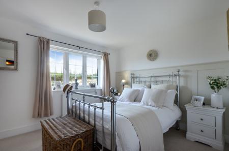 The first-floor landing, featuring sage green walls and plush carpeting, provides access to the home’s two comfortable double bedrooms and a stylish family bathroom. Bedroom one is a bright, airy space with large windows overlooking the garden, while bedroom two offers a sophisticated feel with elegant wood panelling and views to the front. The bathroom is beautifully appointed with neutral floor-to-ceiling tiling, a full-sized bath with a glass shower screen, and a modern wash basin.
