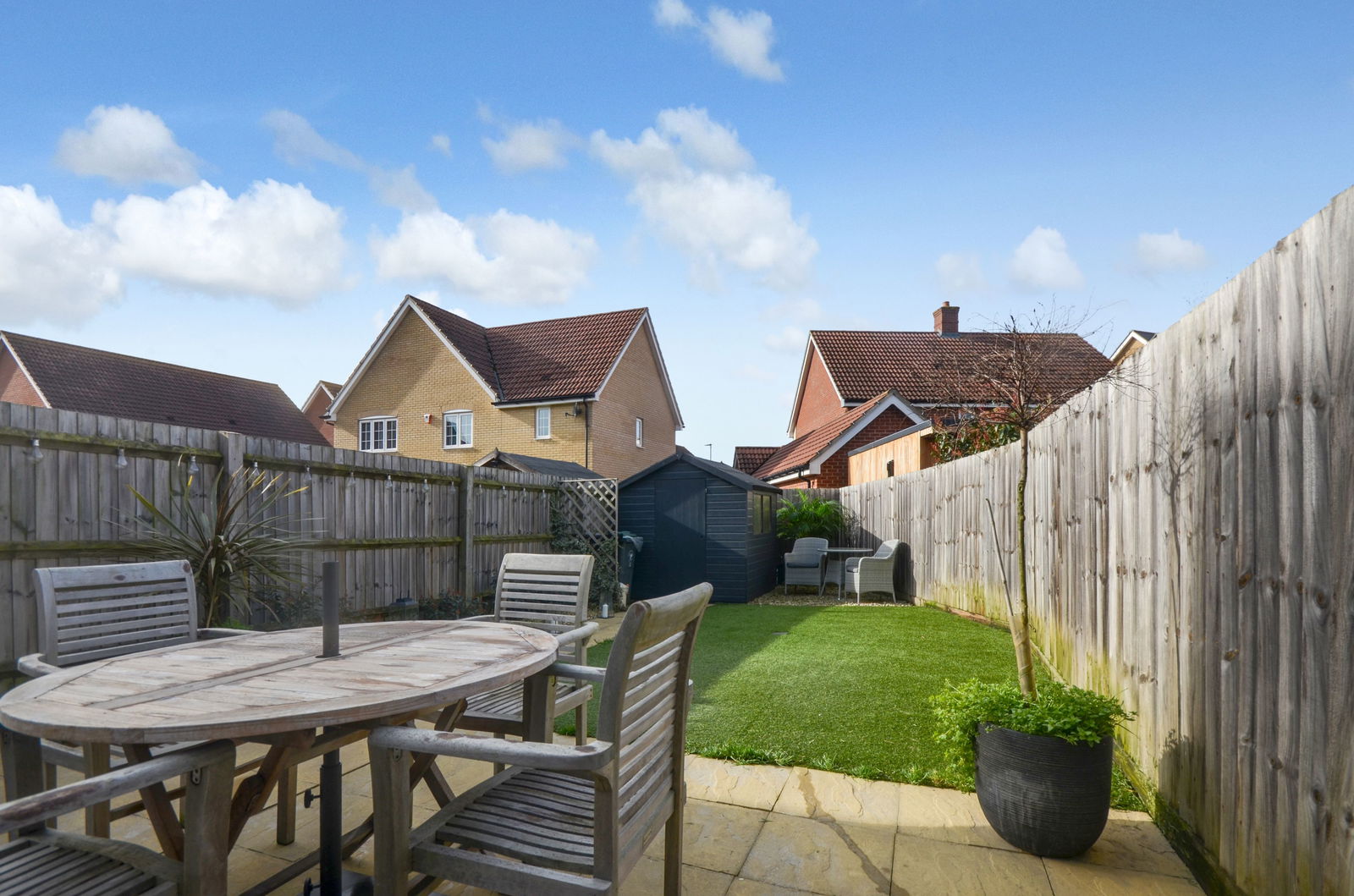 To the front, the property presents a classic brick facade enhanced by neatly manicured ornamental trees and a paved pathway. The private rear garden has been thoughtfully landscaped for both relaxation and entertaining, featuring a large stone-paved patio area that leads onto a low-maintenance artificial lawn. The entire outdoor space is enclosed by secure timber fencing and includes a practical dark-grey storage shed at the foot of the garden.