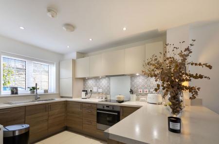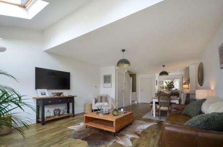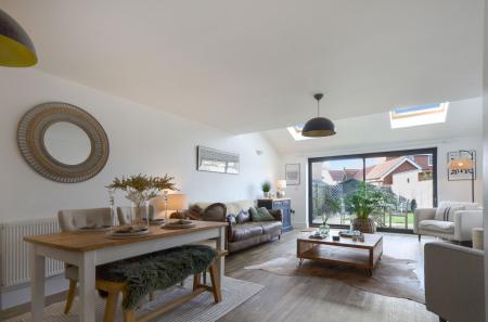 The ground floor opens with a practical entrance hall leading to a modern downstairs WC. The two tone kitchen is a standout feature, complemented by bright white worktops and a decorative tiled backsplash. It comes well-equipped with integrated appliances, including an oven and induction hob, and features a breakfast bar that creates a natural transition into the living space. This leads into the expansive lounge and dining room, flooded with natural light from two large overhead skylights and broad sliding glass doors.