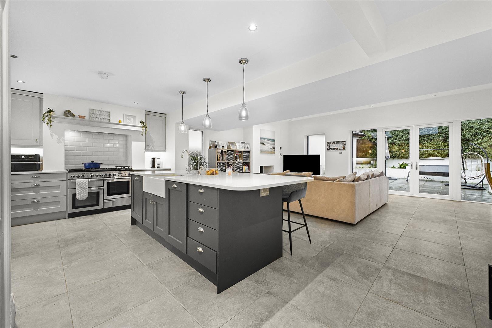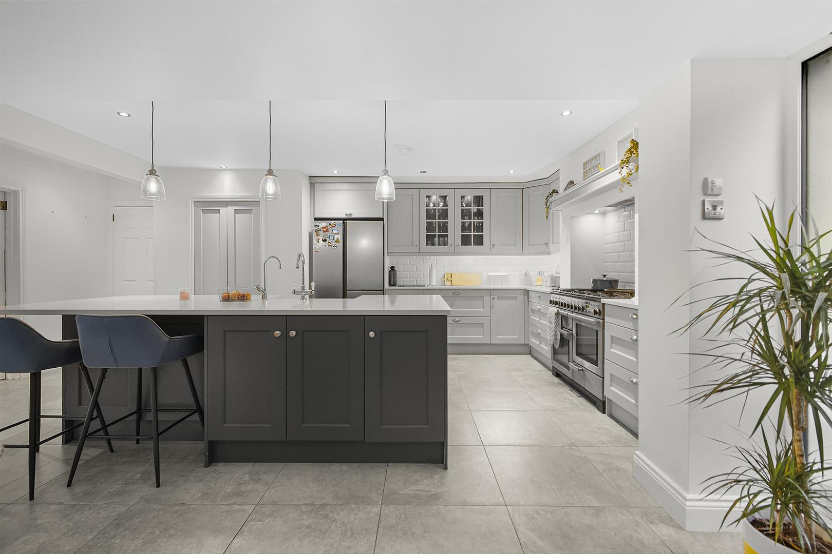 Kitchen - 3.45m x 6.20m (11'4" x 20'4") - Porcelain tiled floor, recessed spot lights, feature lighting above island, excellent range of bespoke high and low level units with solid wood doors and Quartz worktop, chip shop style tiled splashback, under counter lighting, Island with breakfast bar seating, large walk in pantry, space for American fridge / freezer, deep pan drawers, display cabinets, space for Range cooker, extractor fan, double inset ceramic Rangemaster sink, chrome mixer tap, hot water tap, integrated dishwasher, integrated pull out bins