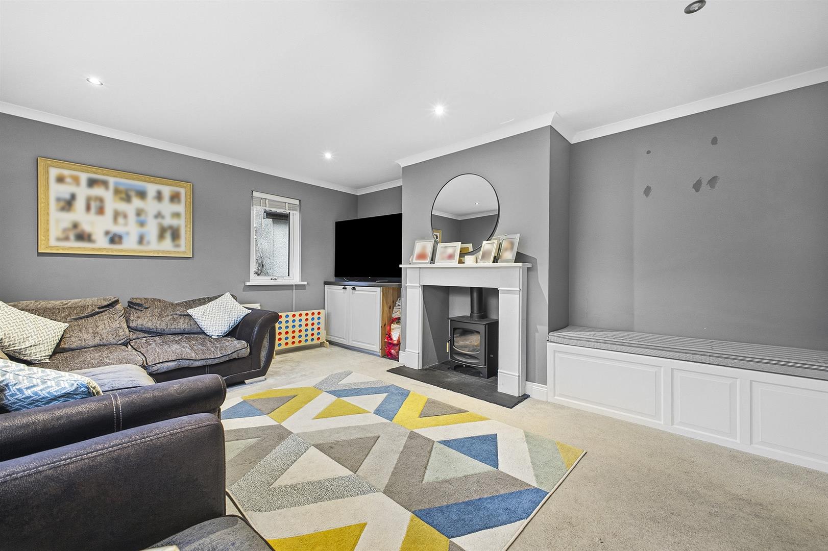 Family Lounge - 4.11m x 5.18m (13'6" x 17') - Carpet, outlook to front, cornice ceiling, recessed spotlights, built in seating, feature multi burning stove with Sandstone surround and slate hearth.