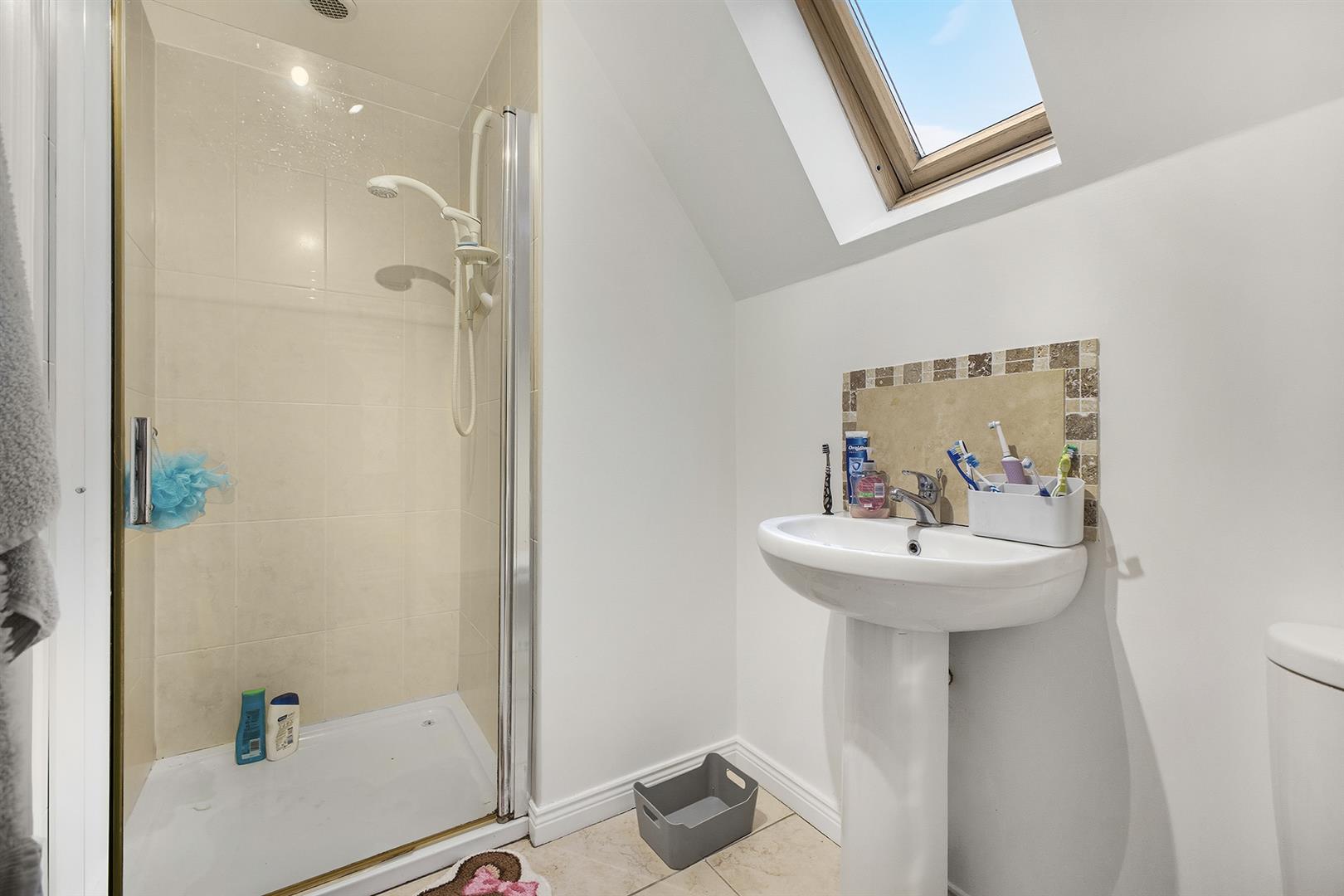 Family Shower Room - Porcelain tiled floor, Velux to rear, shower enclosure with Mira Sport electric shower and tiled walls, pedestal sink with chrome mixer tap with tiled splashback, low flush WC, chrome heated towel rail