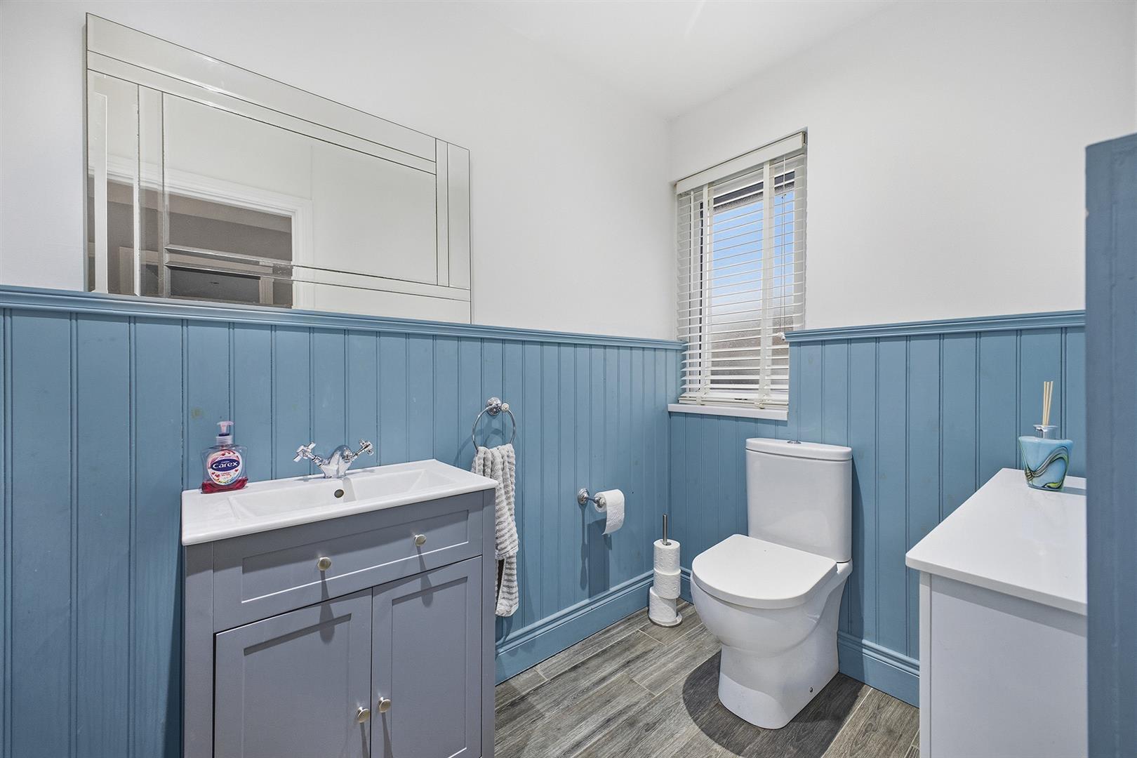 Downstairs Wc - Wood effect tiled floor, outlook to front, recessed spotlights, feature panel walls, two-piece suite comprising; low flush WC and vanity unit with sink and chrome mixer tap.
