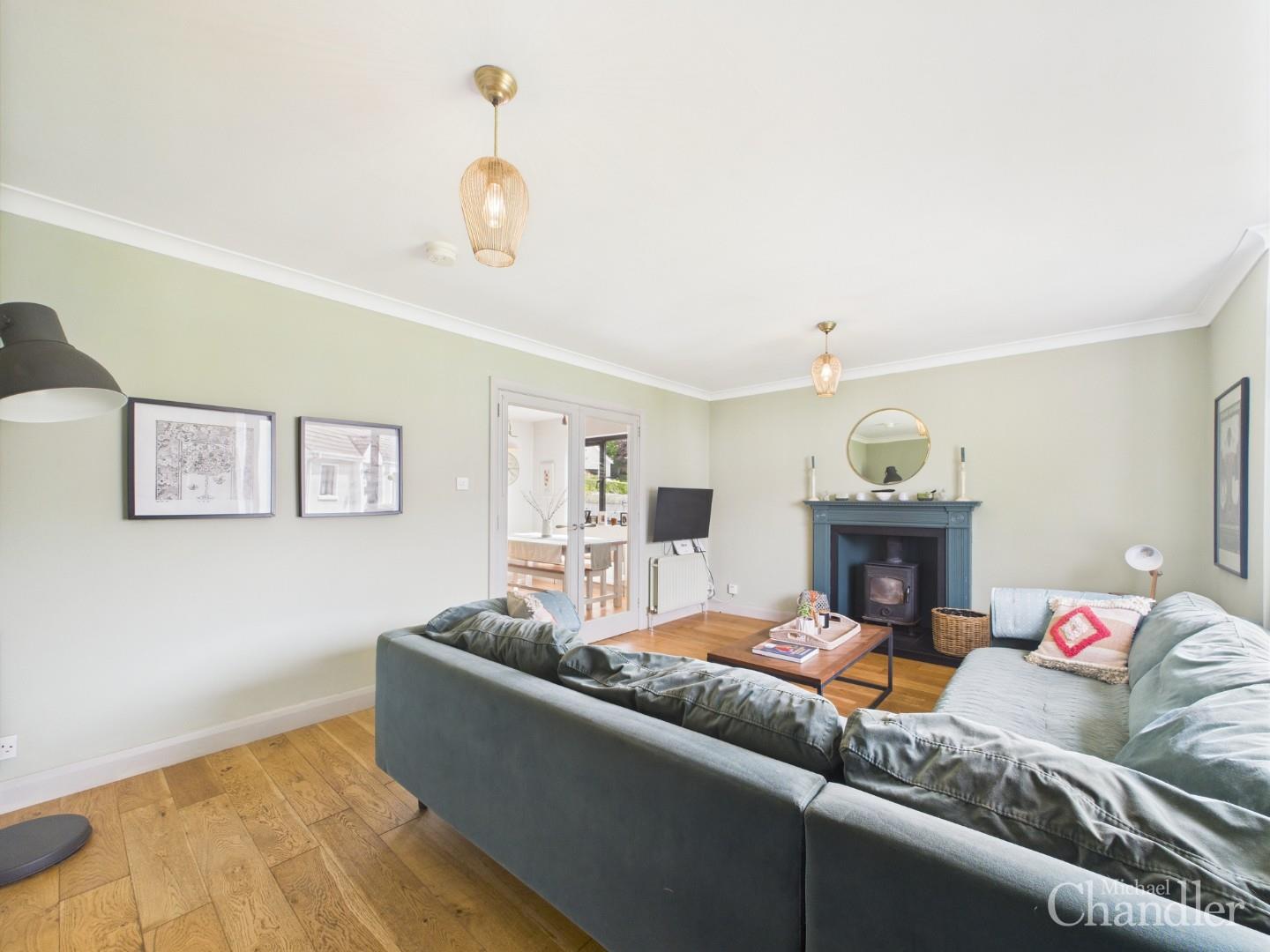 Bright and spacious living room with a stunning feature fireplace and a multi fuel stove