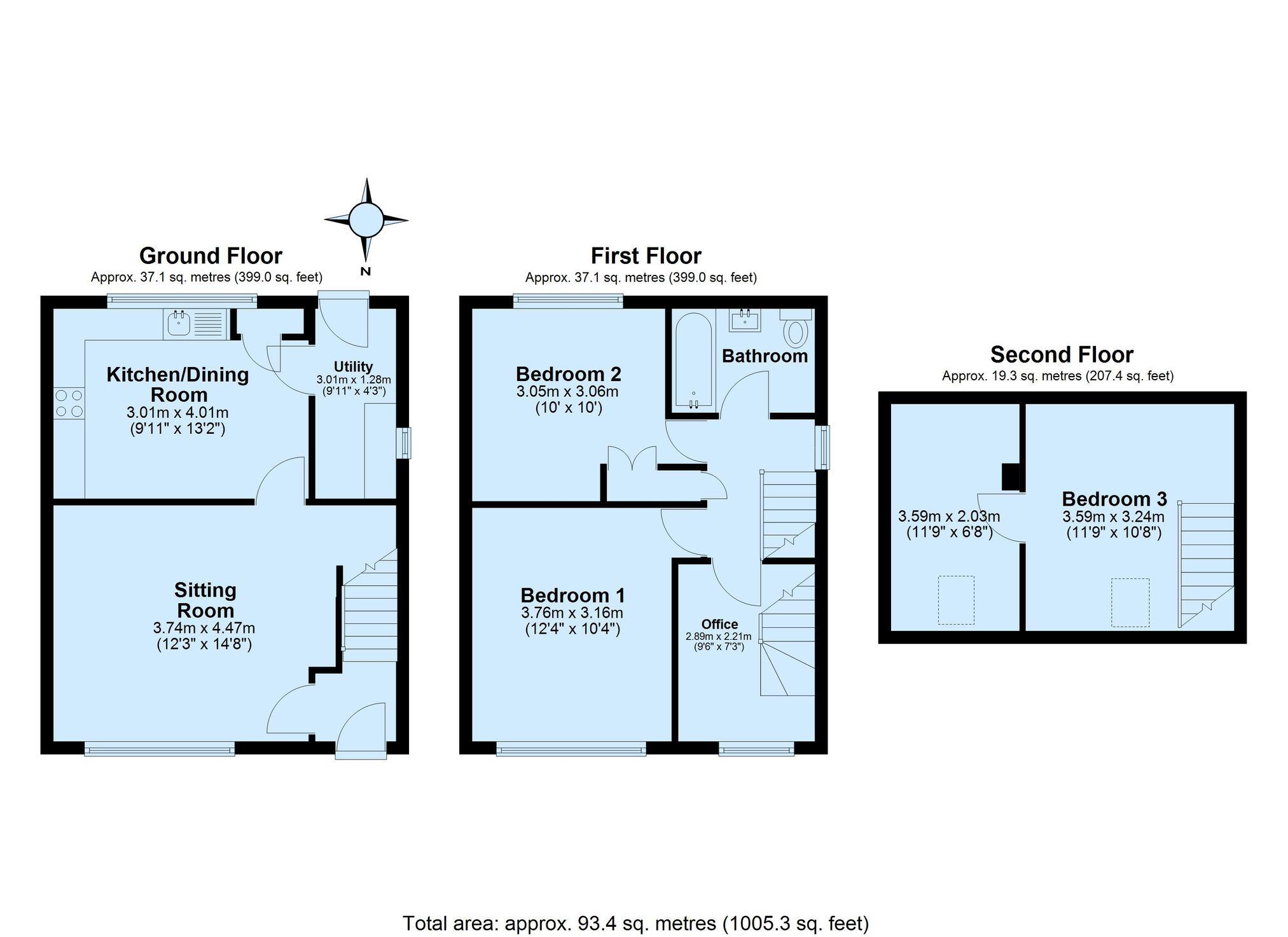 The first floor comprises two spacious double bedrooms, a shared family bathroom, and a useful office space with stairs leading to the second floor, which boasts a further bedroom.