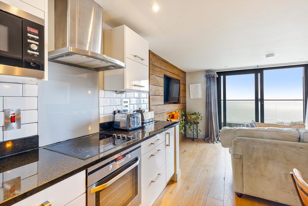 - Spacious open-plan living, dining and kitchen area with large sliding doors and wooden floors