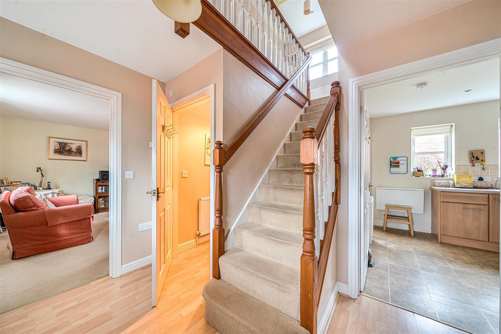 To the front is a covered porch with lighting and glazed side panels and solid door leading to the entrance hall. Here there are the stairs to the first floor and a cloakroom with wc and hand basin. There is a good sized sitting room with window to front and French doors to rear. On the other side of the hall is the dining room with a window to the front elevation. To the rear is the kitchen which features a good range of work surfaces with base and wall mounted cupboards, range cooker with extractor hood over, built in dishwasher, one and a half bowl sink unit with mixer taps over, tiled splashbacks, ceiling downlighters and space for fridge/freezer. Opening leading to the utility room which has a door to the garden and work surface with inset sink unit with space and plumbing for washing machine below, Grant oil fired boiler for heating and hot water. On the first floor is a large landing with hatch to loft space and airing cupboard. The main bedroom is a good double room with ensuite shower room off with a white suite of Wc, pedestal basin and corner shower enclosure with thermostatic controls, ceiling spotlights. The second bedroom is also a good double and there is a further small double. Finishing the accommodation is a family bathroom with bath which has a mixer tap with shower attachment, wc, basin and heated towel rail.