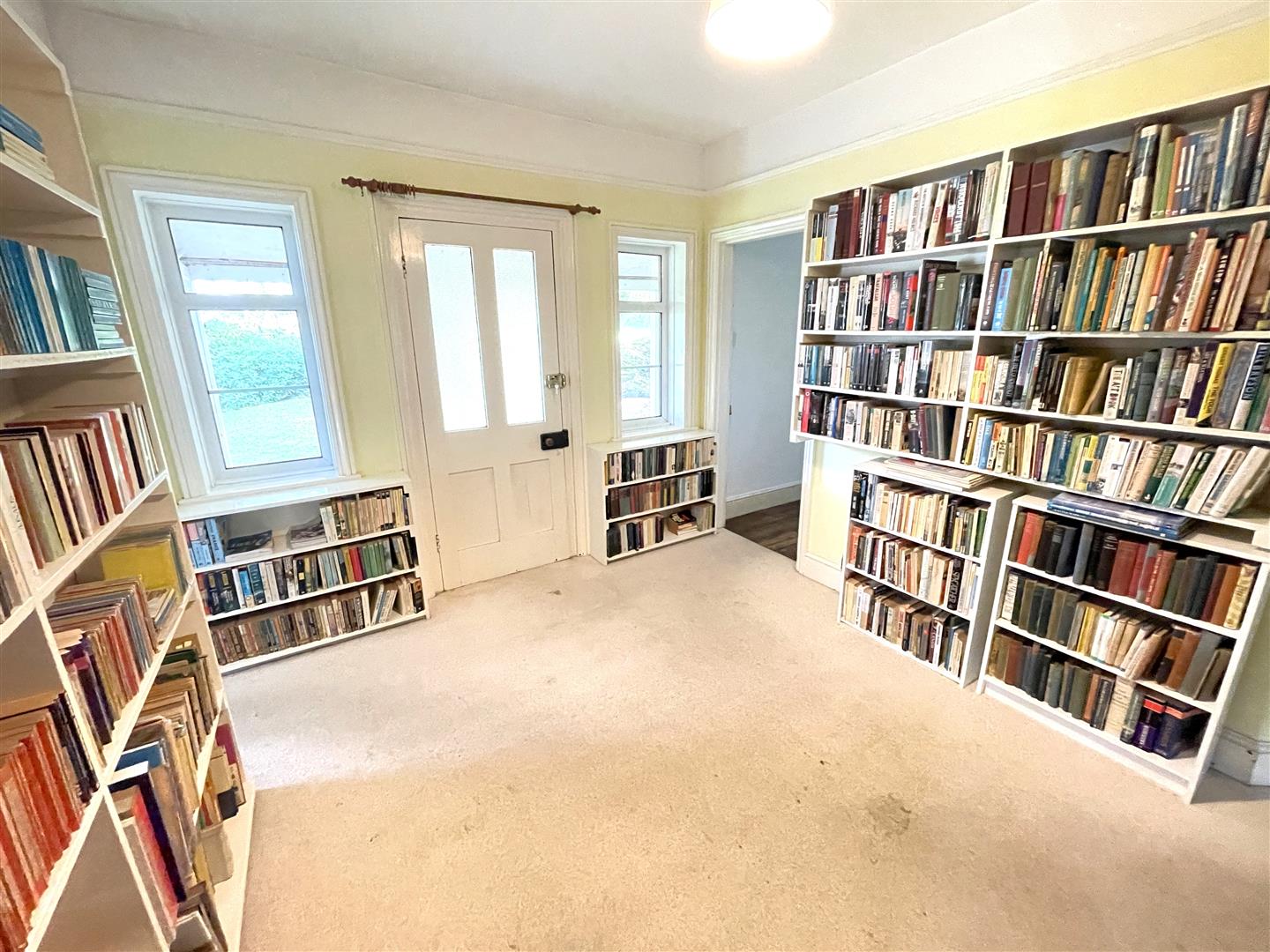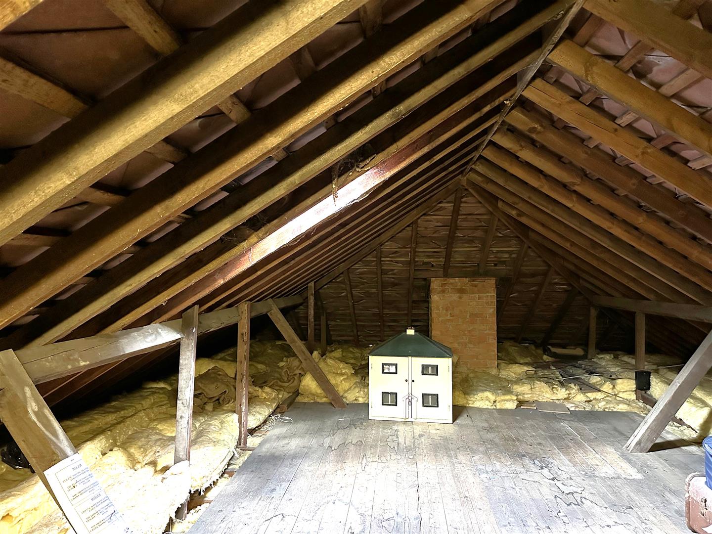 There is a long veranda with paned and glazed ends at the front of the property, perfect as a sitting space, or for garden storage. From here a half-glazed door leads into a large central entrance hall, with doorways radiating off to all rooms, and shelving on all walls. There are a ceiling hatch and a loft-ladder to the large open standing-height loft (potential for conversion), with floorboards and a roof light.
