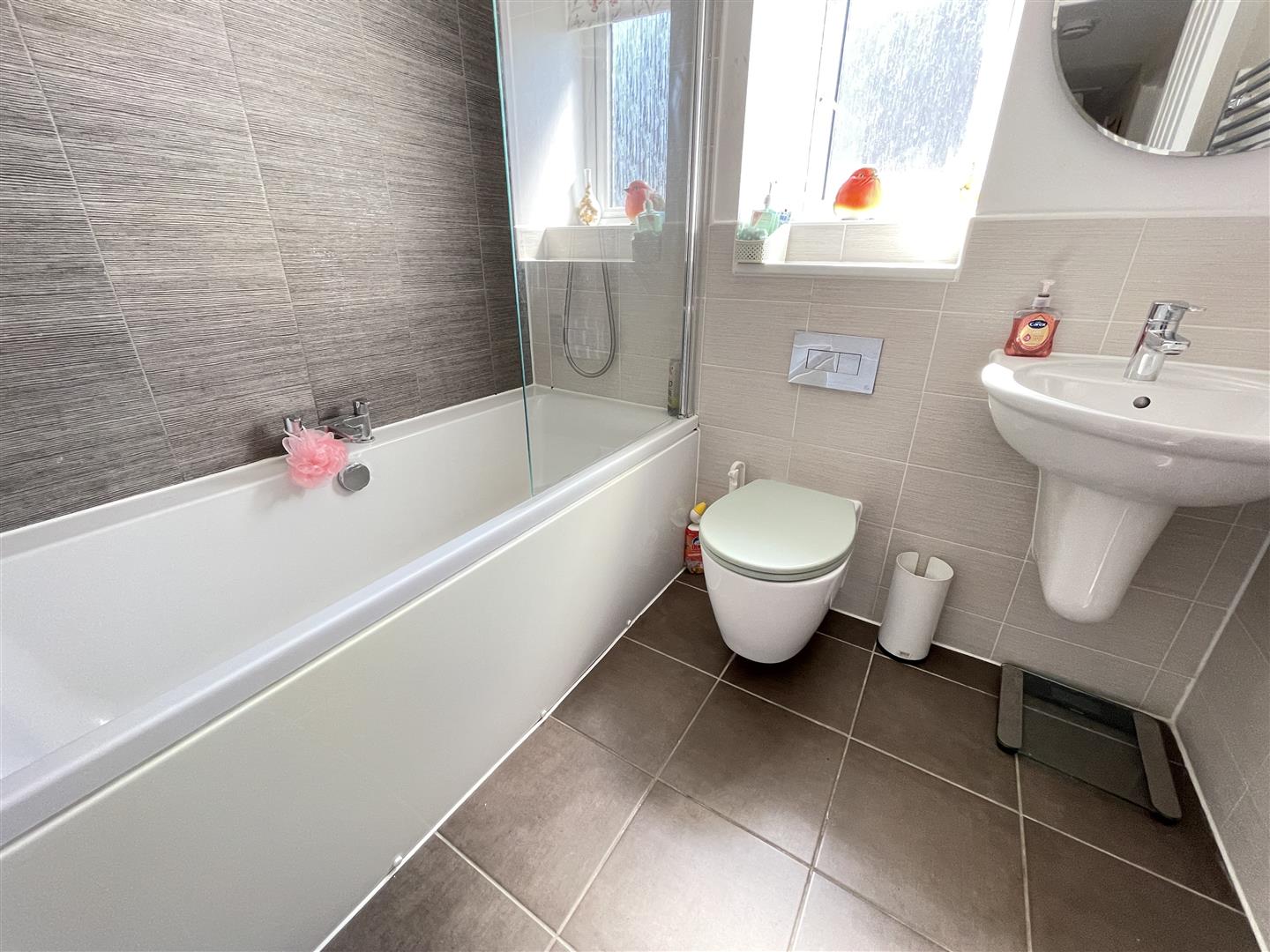 Family Bathroom - 2.01 x 1.7 (6'7" x 5'6") - Panelled bath with central mixer taps, glass shower screen over with thermostatic mixer shower behind, tiled walls, low level WC, wash hand basin, heated towel rail, tiled floor, part-tiled walls, extractor fan.