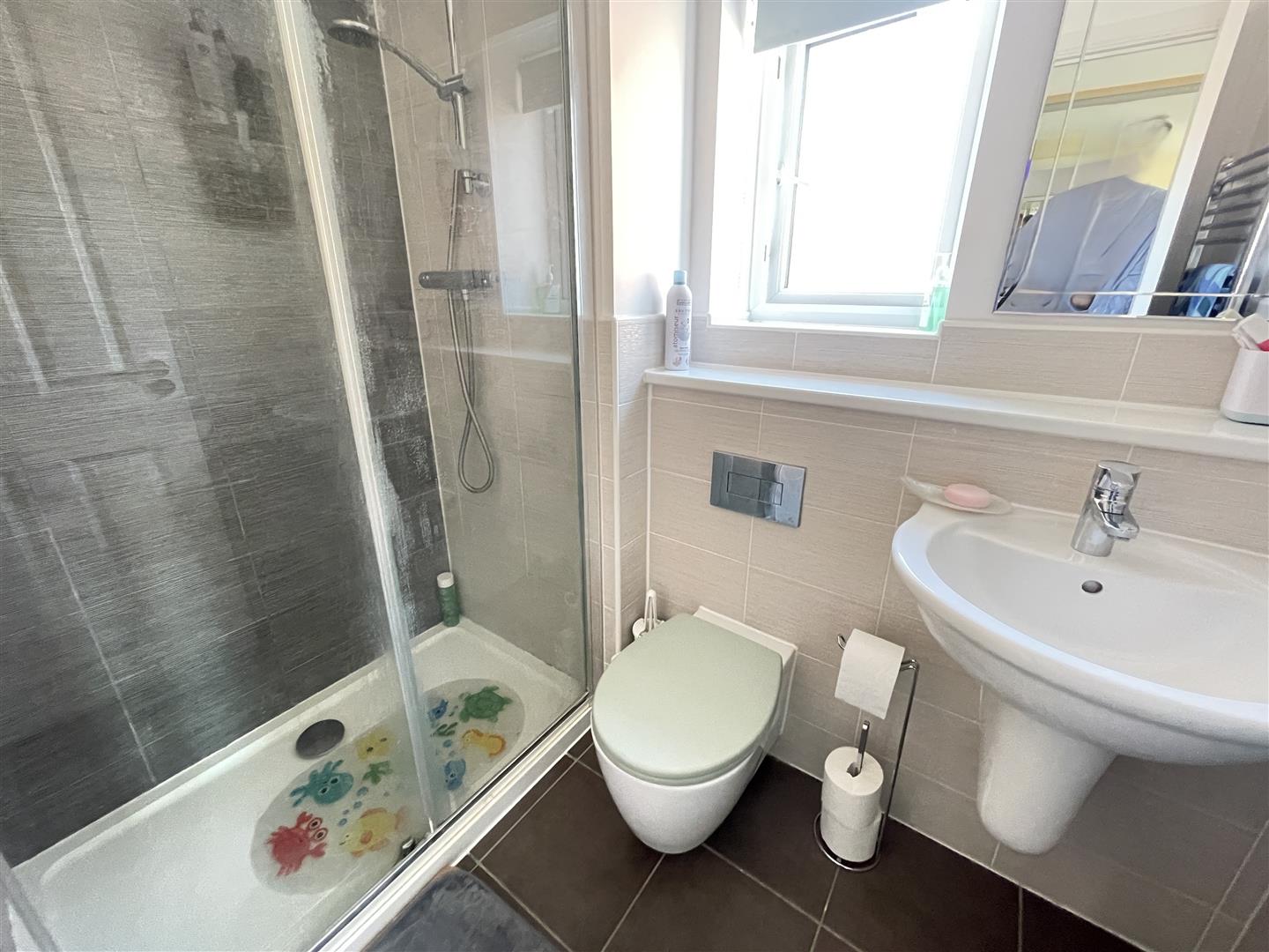 En-Suite Shower Room - Tiled shower cubicle with sliding glass screen and thermostatic mixer shower, low level WC, wash hand basin, heated towel rail, tiled floor, part-tiled walls, extractor fan.