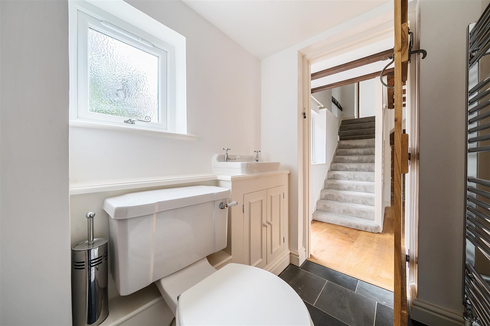Cloakroom - Wash hand basin set into vanity unit, low level WC, heated towel rail, slate floor.