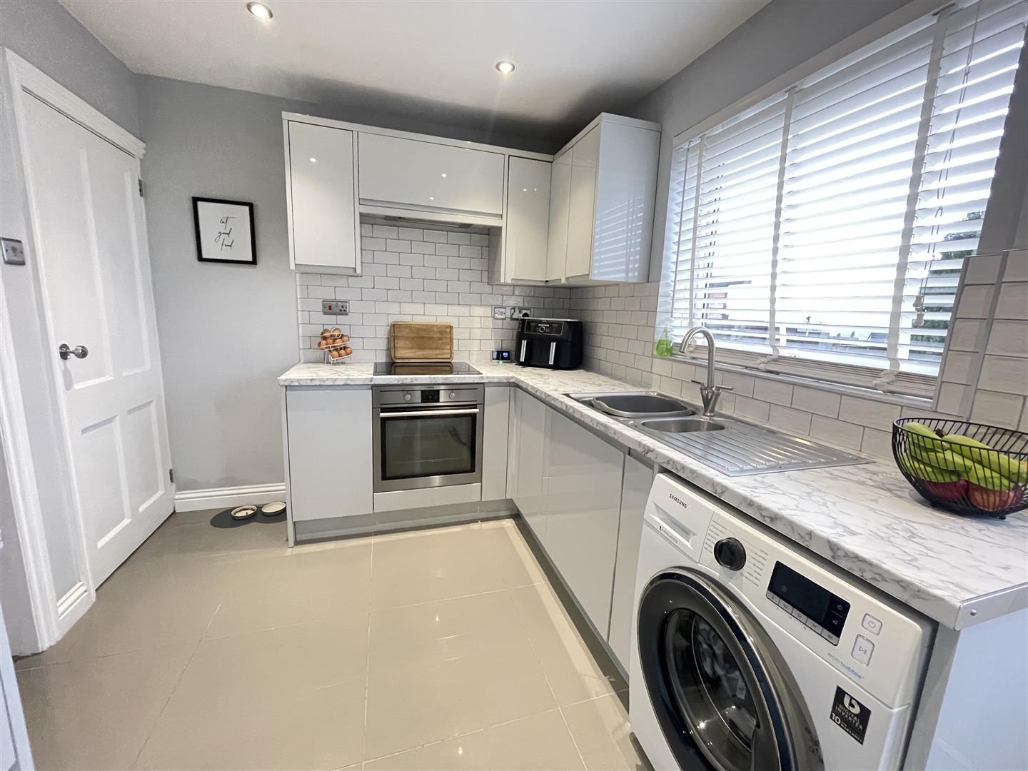 The property has well proportioned accommodation with an extended entrance lobby and a sitting/dining room which has an attractive woodburner, wooden flooring and space for a table chairs. This leads leads through to the kitchen which has an excellent range of grey fronted base and wall units, an integrated oven, hob, extractor and fridge/freezer as well as space for a washing machine. It has an attractive tiled floor, inset spotlights and far reaching views to the rear. There is a useful understair cupboard which has room for a tumble dryer and this also houses the gas boiler which is approximately two years old.