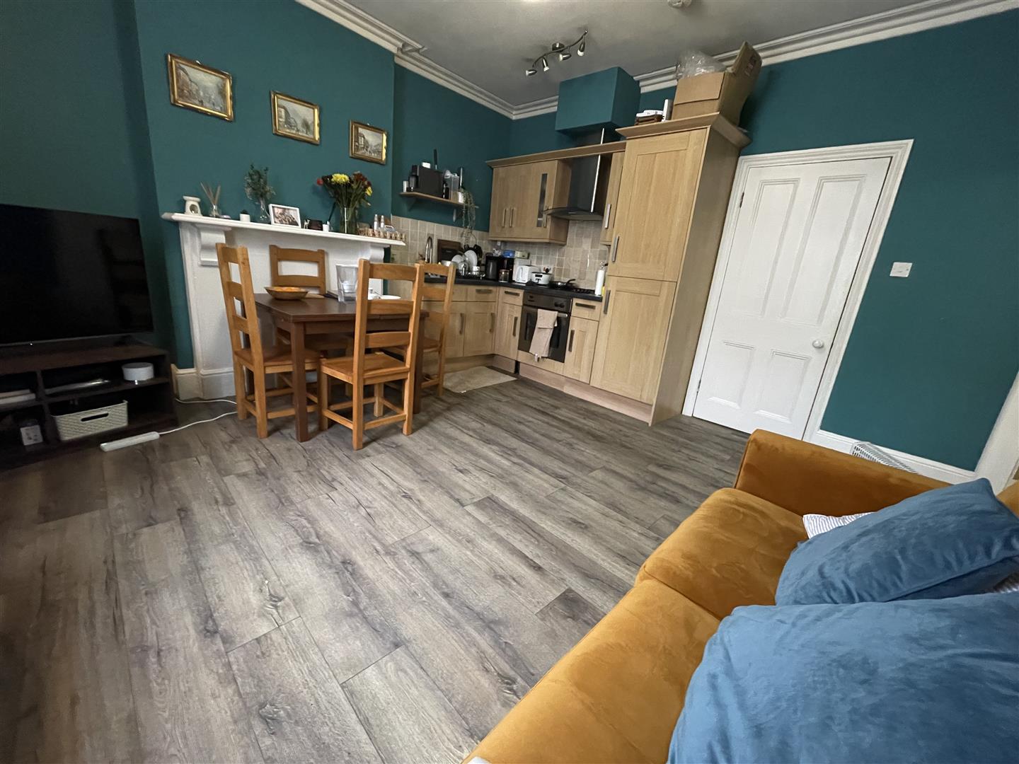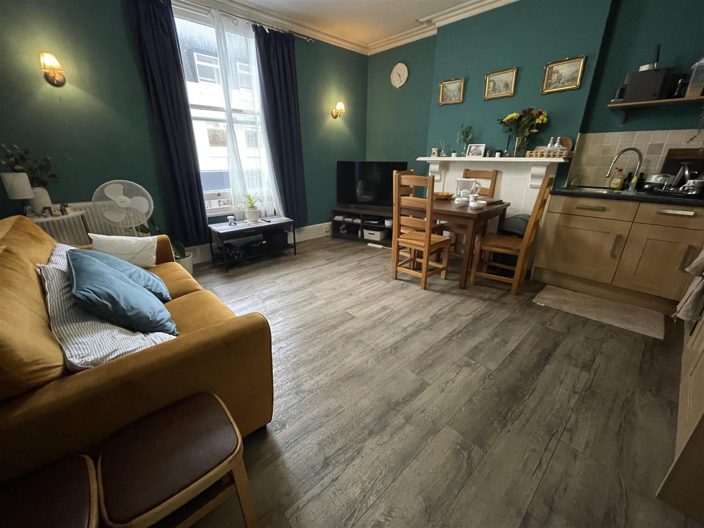 Sitting/Dining Room With Kitchen Area - Sash window to front, radiator. KITCHEN AREA Base and wall units with roll top work surfaces and tiled splashbacks, integrated electric oven with four ring hob and extractor over, stainless steel sink and drainer with mixer tap, integrated fridge/freezer.