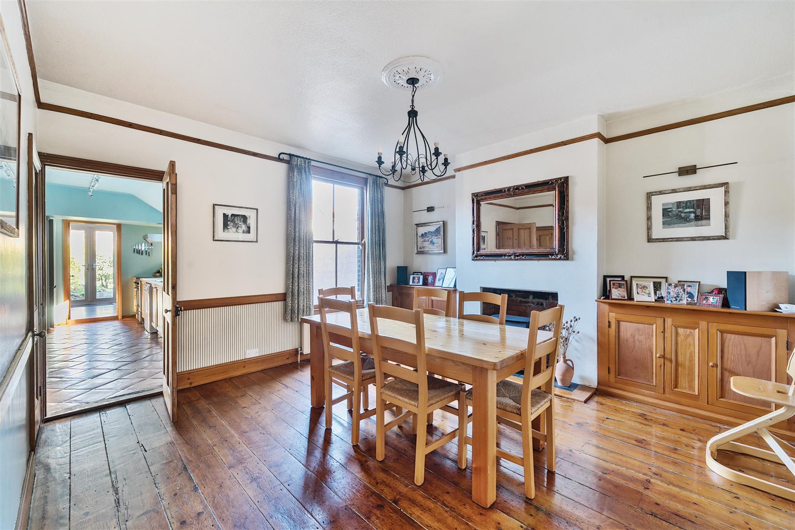 Dining Room - Exposed floorboards, deep understairs cupboard, fireplace opening with slate and wooden hearth. Double cupboards to side of chimney breast, dado rail, picture rail and ceiling cornice