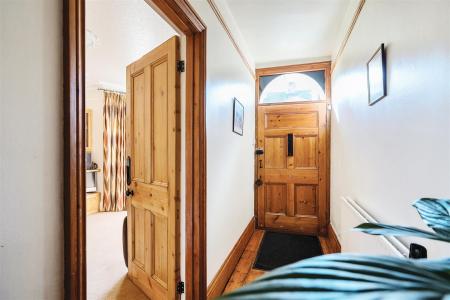 Entrance Hall - Wooden front door with glazed panel above, exposed floorboards, picture rails, stairs to first floor.