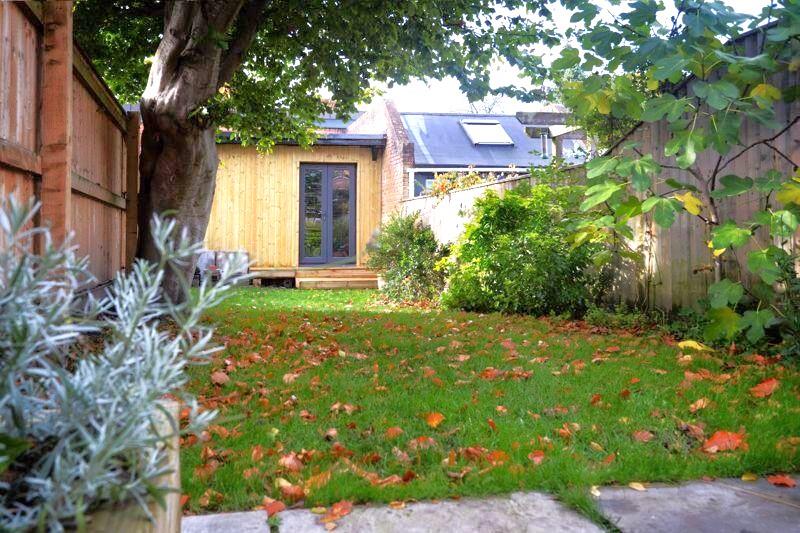 The rear garden is a good length with paved terrace leading to lawn with flower beds, shrubs and trees. At the end of the garden is a timber garden room which is insulated and has light and power, ready for conversion into a home office or studio. To the side of this is a storage area. The whole is enclosed by timber fencing and has a southerly aspect.
