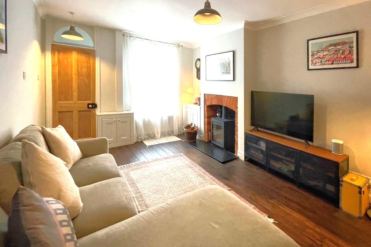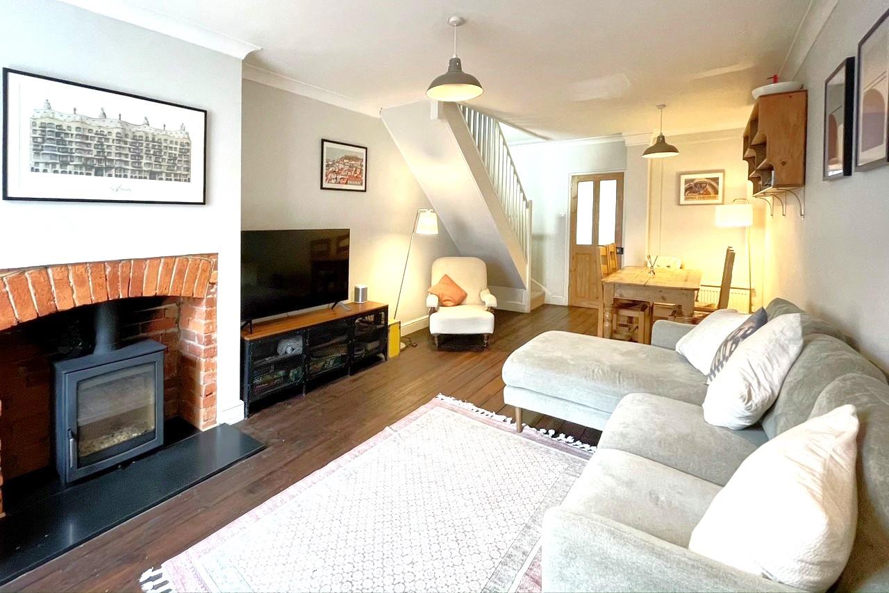 There is a small front garden behind a low brick wall with wrought iron gate. A pathway leads to the front door leading into a useful porch with coats hanging space. This leads into the living room which was originally two rooms and now offers great space for relaxing and entertaining with exposed floorboards, brick fireplace, slate hearth and inset wood burning stove. From here, stairs lead to the first floor. The kitchen is superbly fitted with a range of quartz worktops and breakfast bar with inset sink bowl with mixer tap over, range cooker with extractor hood, built in appliances base, and wall mounted cupboards and drawers, shelving and baskets, tiled floor and door to garden. There is also a utility area with space and plumbing for washing machine which then leads to a cloakroom with a wc and hand basin.