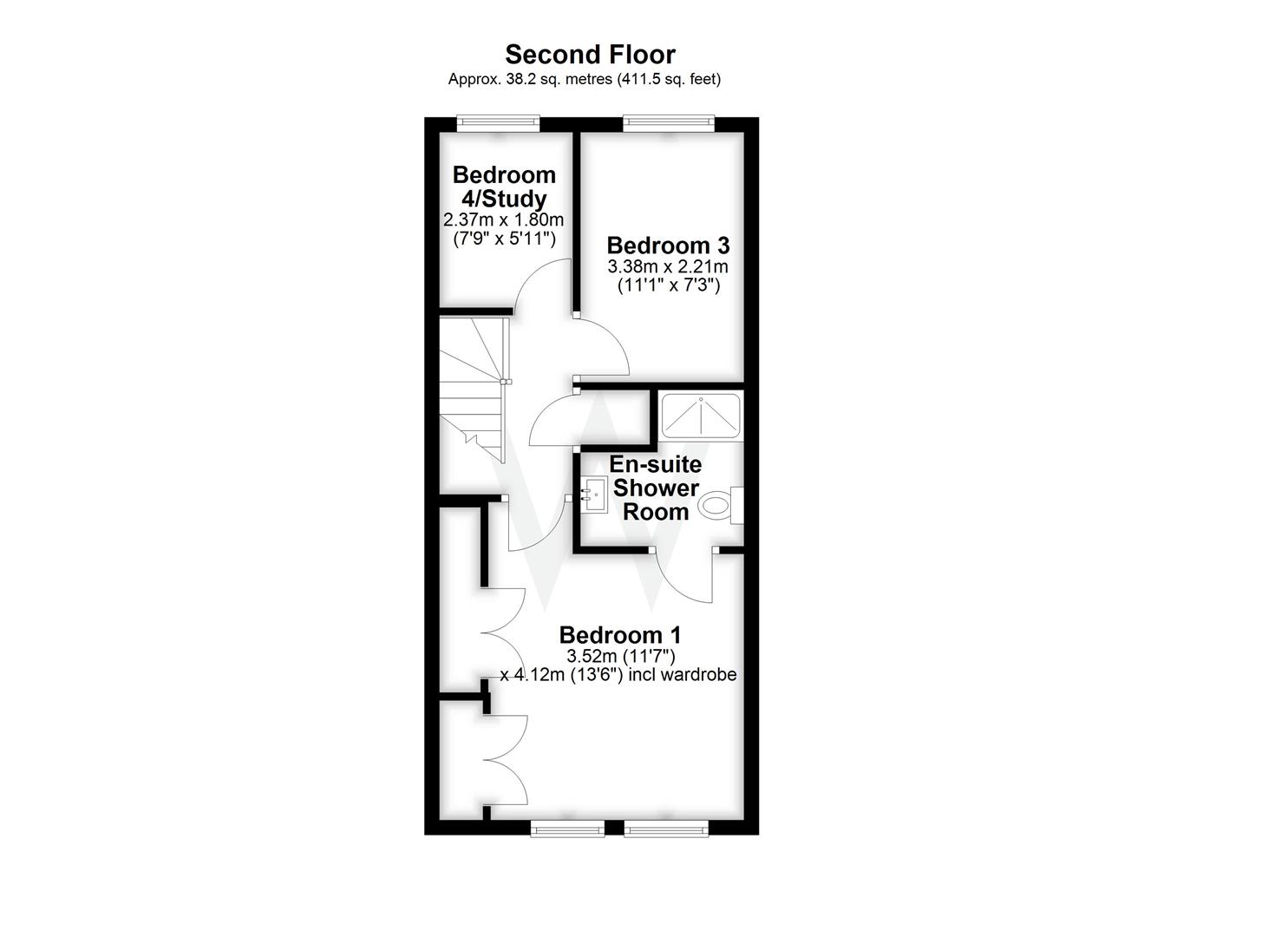 On the second floor is the main bedroom suite, a lovely room with extensive fitted wardrobes and an en suite shower room. There are two further bedrooms, a double and a single.