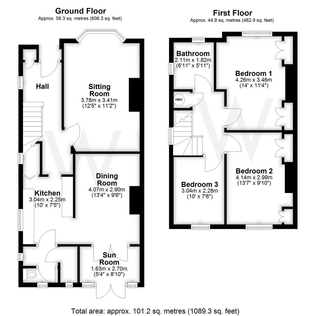 In the kitchen there are work surfaces with inset four ring gas hob and extractor hood over, one-and-a-half bowl sink unit, deep larder cupboard, plumbing and space for washing machine and built-in oven. A door to the rear leads to a lobby off which is a WC and large storage cupboard with window. The kitchen is part open to the dining room which has a fireplace with electric fire and double doors to the sun room from which there are double doors to the garden. On the first floor there are 3 good bedrooms, two with built in wardrobes and a bathroom with white suite and two windows.