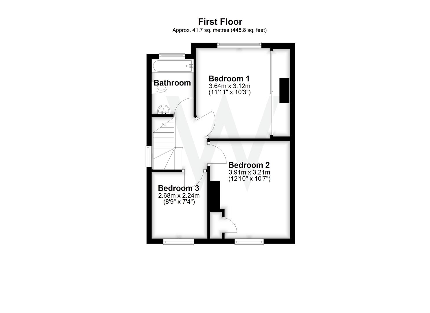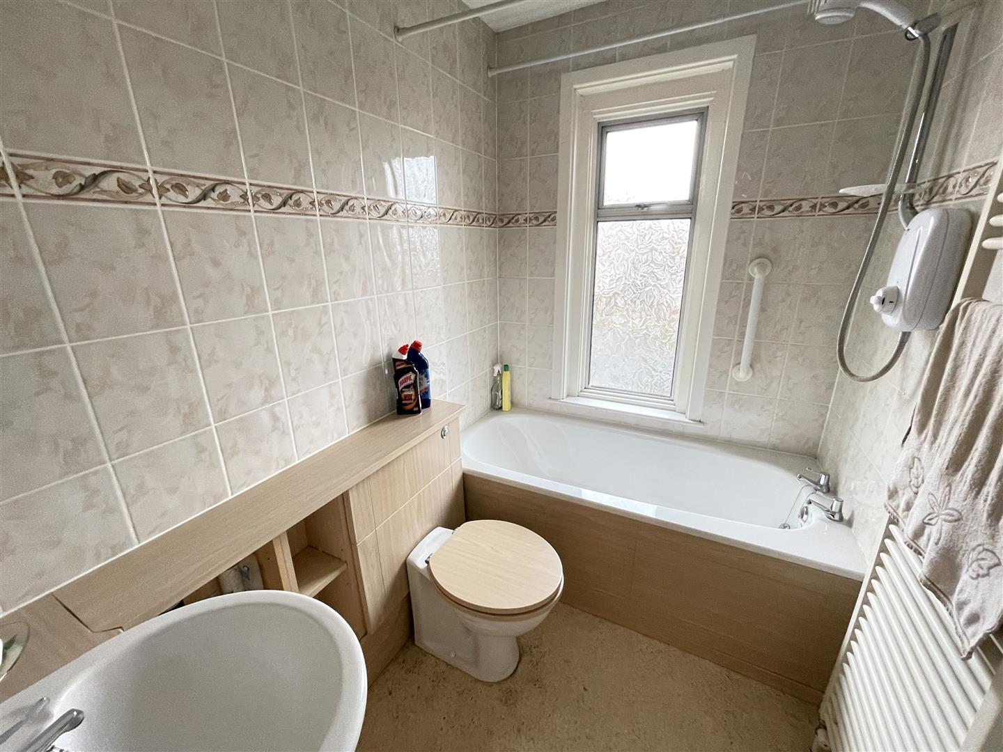 On the first floor there are three bedrooms. The main bedroom has fitted wardrobes and the second bedroom has a feature cast iron fireplace and a cupboard housing the gas boiler. The family bathroom has a white three piece suite with a shower over the bath and storage cupboards.