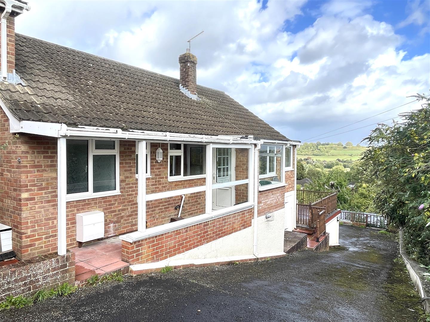 A quite exceptional opportunity to purchase a semi-detached bungalow with stunning 180 degree views, together with 3 garages, stable block, bags of parking and a good garden, now ready for updating.