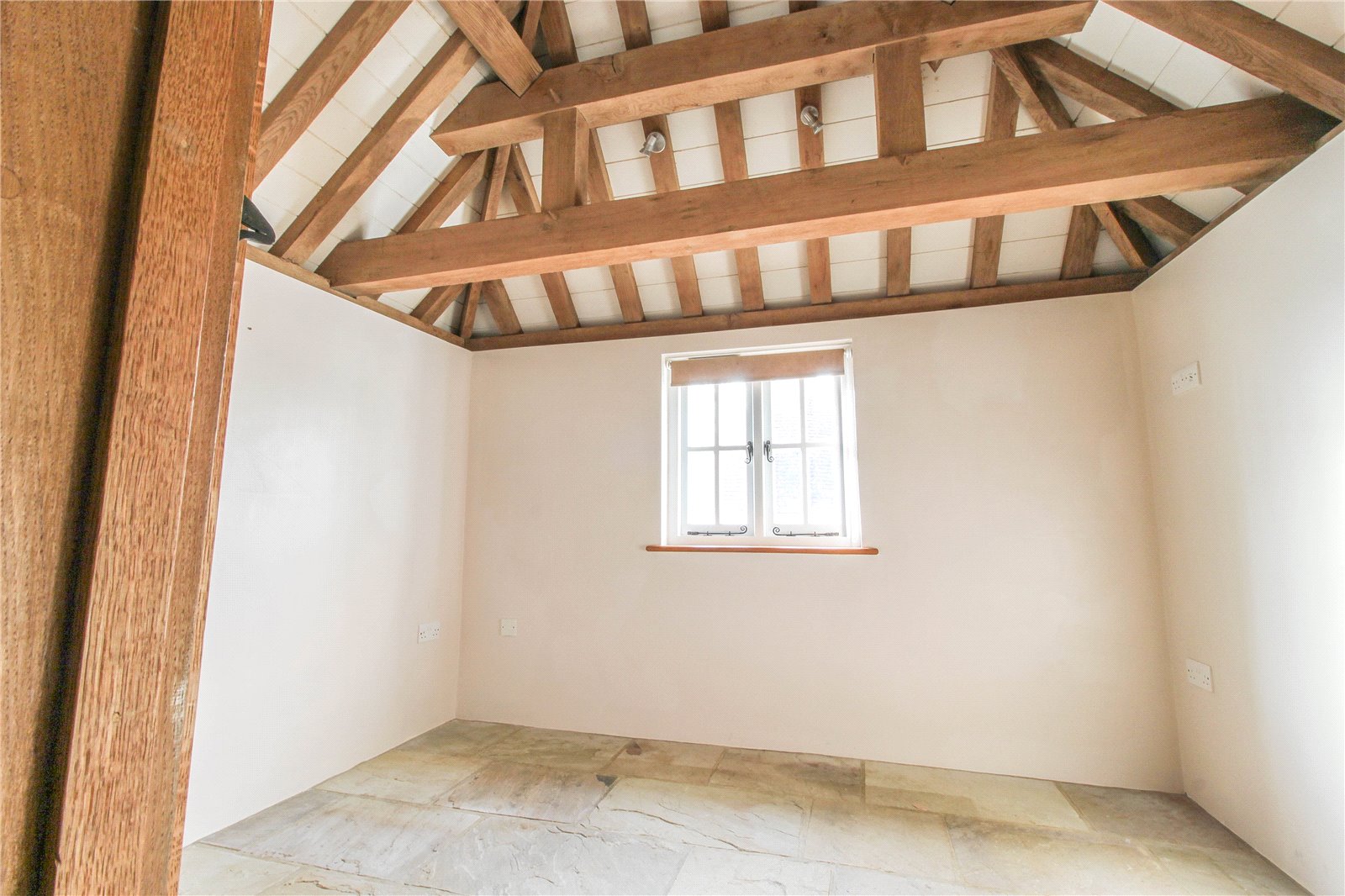 Double Bedroom High vaulted ceiling with exposed framework and spot lights. Small pane window with oak sill to gable end with views towards countryside. Oak doors into built-in cupboard housing pressurised hot water cylinder and electric Heatrae Sadia central heating boiler. Flagstone flooring.