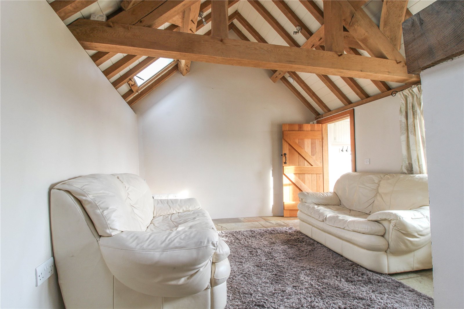 Sitting/Dining Room Featuring a high vaulted ceiling with exposed pegged oak framework, clasped purlins, wind braces and solid oak rafters. Spot lights. Open fireplace with rolled steel log burning stove with stone hearth and oak/stone display sills above. Sandstone flooring. Small pane picture window with oak sill to front aspect overlooking main garden with long views beyond towards rolling countryside. Two Velux Conservations lights to rear aspect. Ledged and braced solid oak panel door into shower room connecting through to bedroom. Further similar door into kitchen.