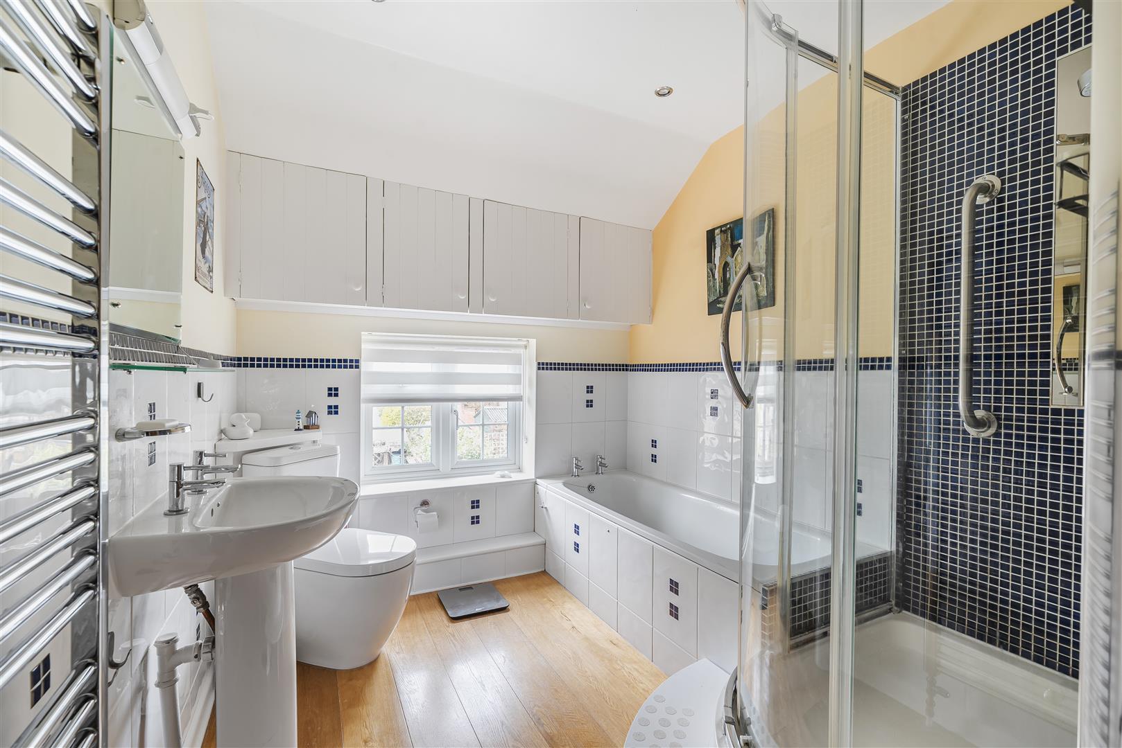 Bathroom - Shelved airing cupboard with lagged hot water tank and immersion heater. Tiled shower cubicle with thermostatic mixer shower, panel bath, corner low level WC, wash hand basin, oak flooring, high level cupboards, part-tiled walls. Extractor fan, heated towel rail.