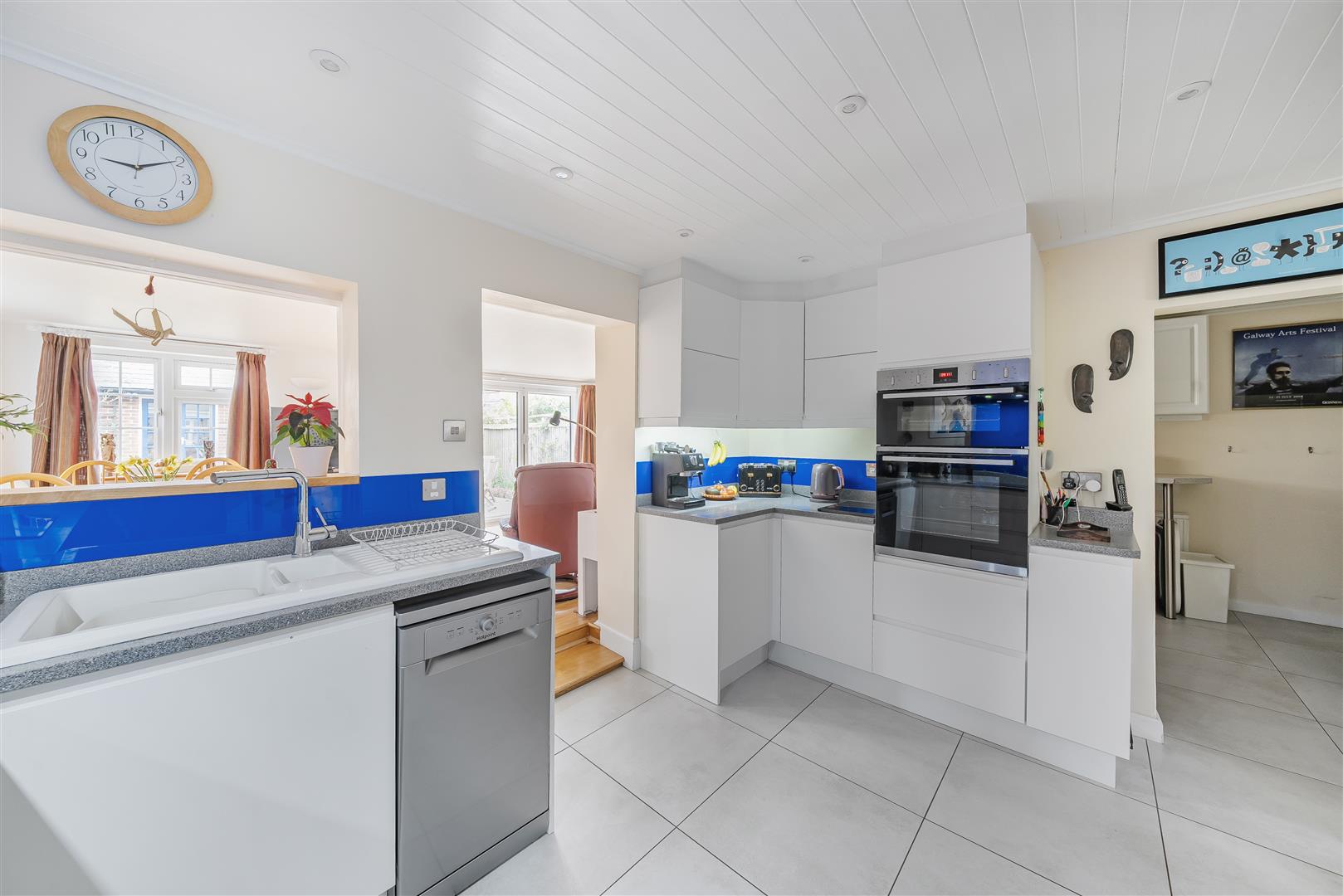 Kitchen - Tiled floor, range of work surfaces with inset single drainer ceramic sink unit with mixer tap over, four ring electric hob with stainless steel extractor hood over, space and plumbing for dishwasher, space for American-style fridge-freezer, double built-in oven.