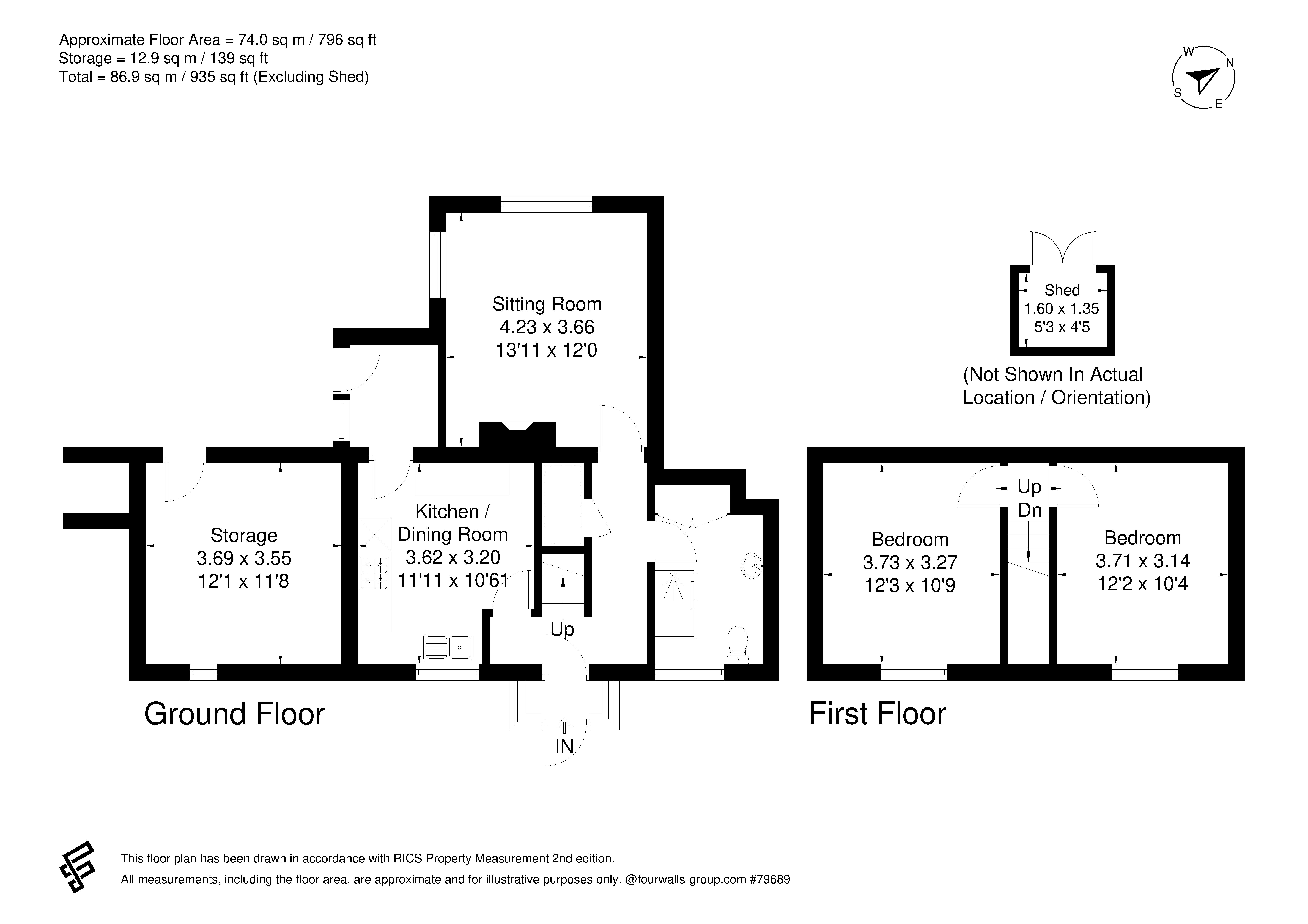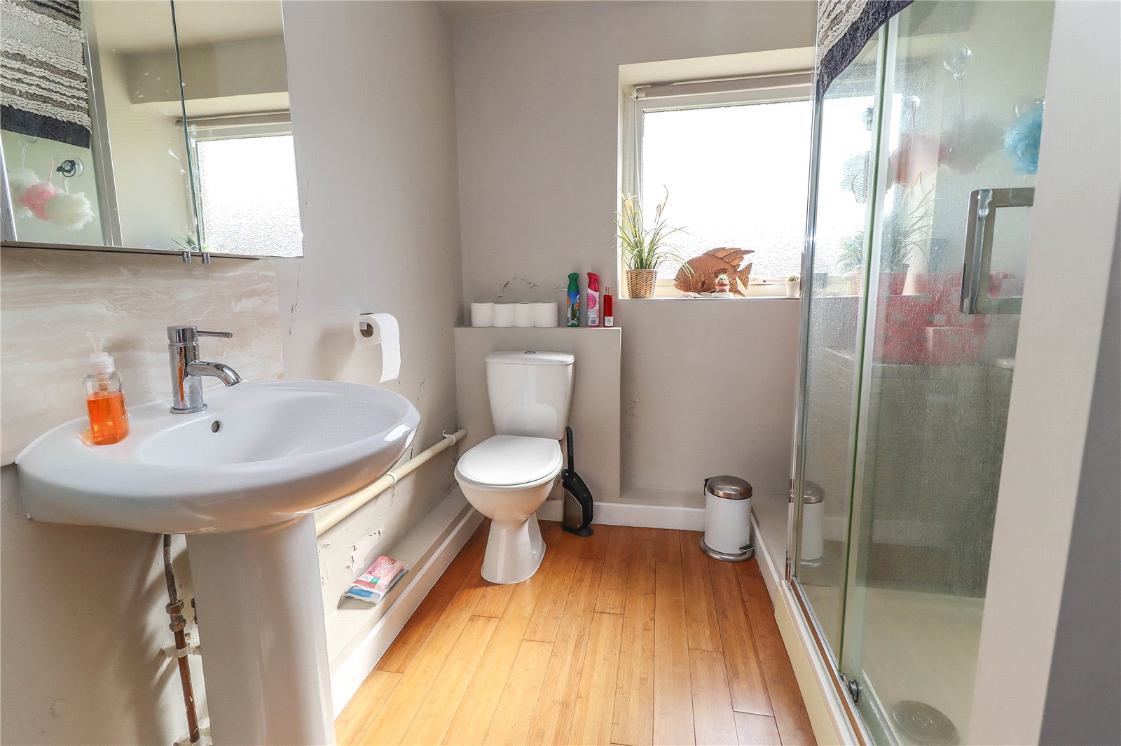Shower Room White suite. Pedestal wash hand basin with mixer tap, tiled splashback and mirror fronted cabinet above. Low-level WC. Sliding glass door into glass/tiled enclosure with electric shower. Large recess to one side formally the position of a bath. Obscured glazed window to front aspect. Bamboo flooring. Ceiling light point. Double doors conceal deep cupboard housing lagged copper cylinder with fitted immersion; slatted shelving to one side.