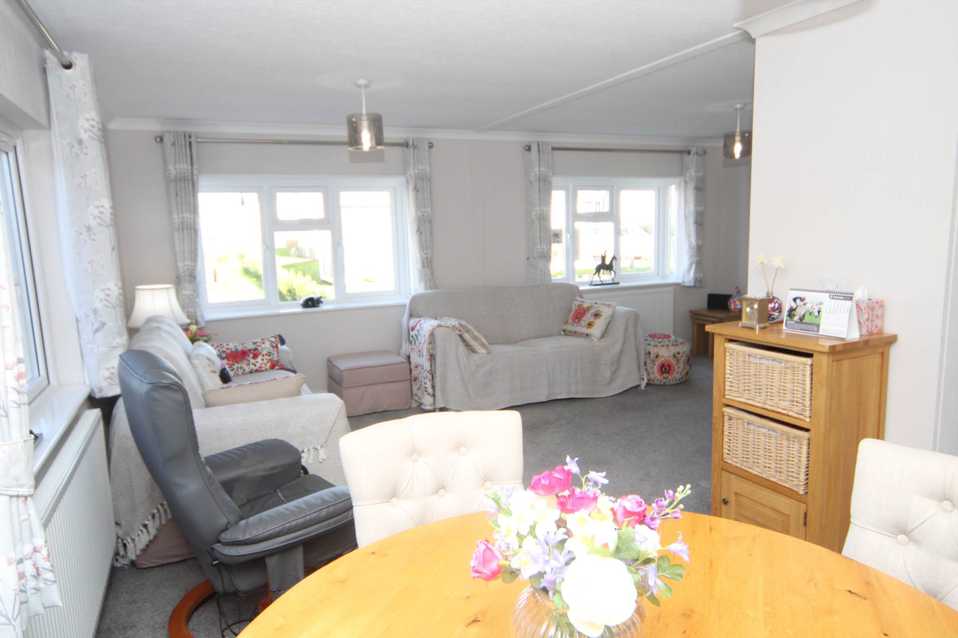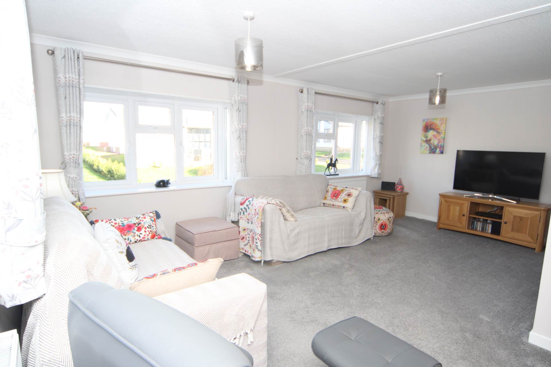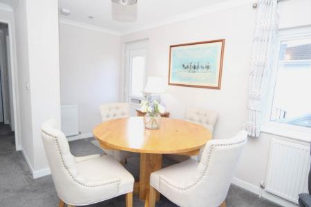 A splendid Park Home situated on a select development. The property is entered via the uPVC double glazed entrance door with inset detail. The vestibule has cloaks hanging facilities and opens out to the impressive open plan reception and kitchen accommodation. The principle reception room being the Lounge is light and airy with 2 uPVC double glazed bay windows with deep sills. There is ample room for reception furniture, a wall mounted log effect remote controlled electric fire and radiators. The dining area is a very social space being situated in between the kitchen and the lounge. The modern contemporary Kitchen includes a comprehensive range of wall and base units with roll top work surfaces and matching upstands. 4 ring gas hob with a stainless steel splashback, canopy and extractor over and electric oven beneath. Further built in appliances include fridge/freezer, washing machine and dishwasher. A further useful storage cupboard houses the heating and hot water boiler. There are uPVC double glazed windows and a uPVC double glazed door.