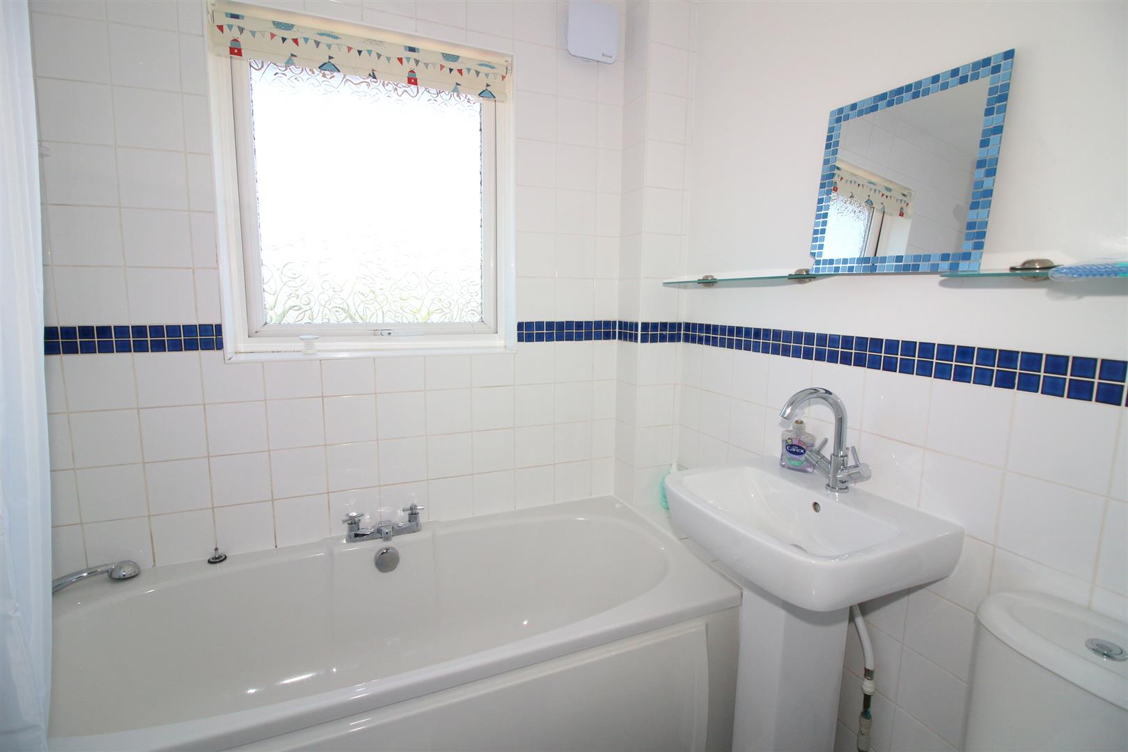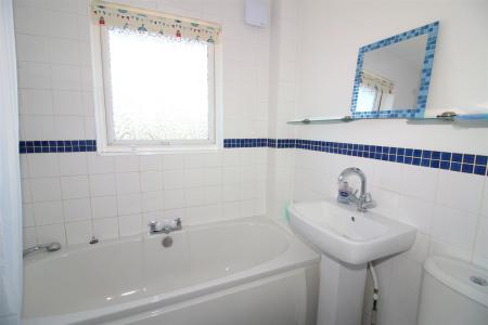 Bathroom - Modern matching white bathroom suite comprising panelled bath with electric shower above, pedestal wash hand basin, low level w.c., part tiled walls, radiator, obscure glass window to the front aspect.