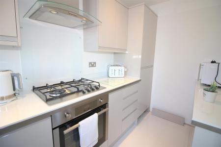 Kitchen - 3.58m x 1.78m - Modern matching kitchen comprising wall mounted and base units with work surfaces above, single drainers sink unit with mixer tap, tiled splash backs, built in fridge/freezer, built in washing machine, built in electric oven with gas hob and extractor hood above, various power points, double glazed window to the front aspect.