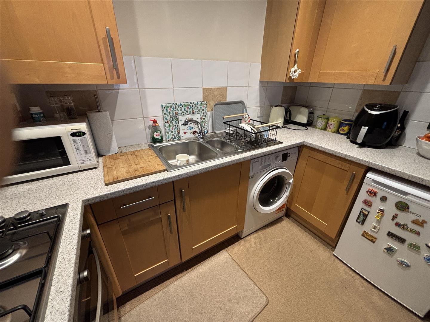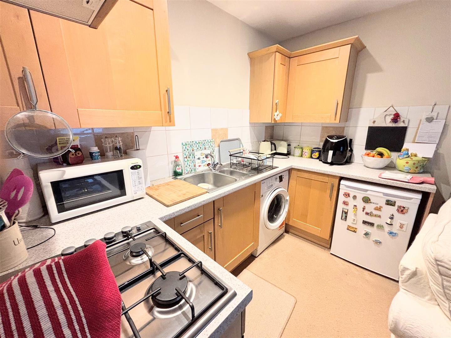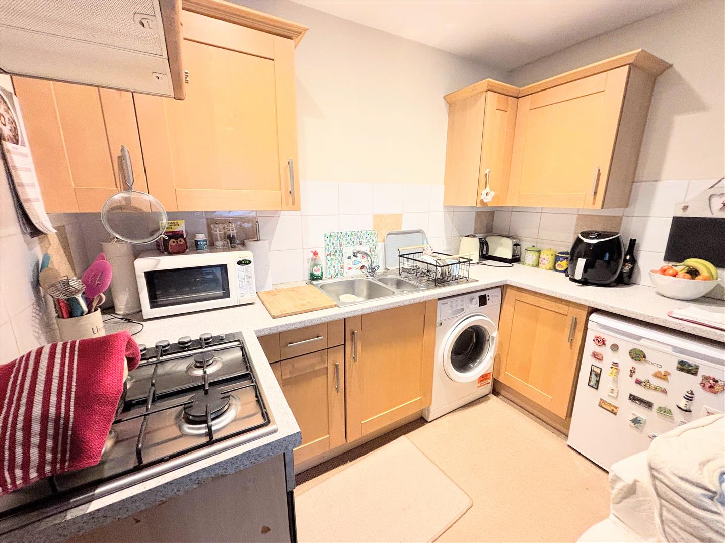 Kitchen / Living Room - Fitted with a matching range of base, drawer and wall mounted units, one and a half bowl single drainer sink unit with mixer tap, tiled splash backs, roll edged working surfaces, space and plumbing for washing machine, space for fridge. Built-in oven with four-ring gas hob and extractor over, uPVC The living area comprises of double glazed window to front aspect, radiator, fitted carpet and ceiling lights.