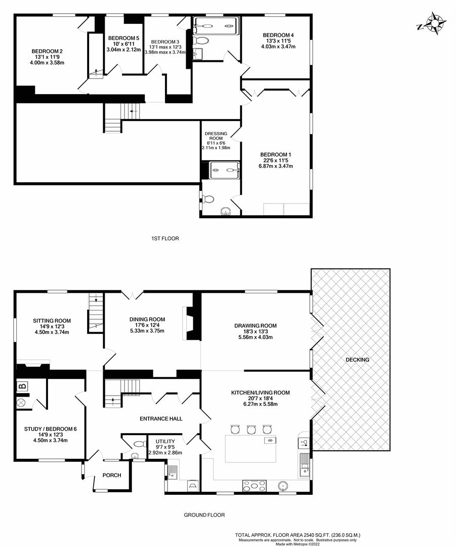 The accommodation briefly comprises: On the ground floor; Entrance hall; large and impressive, laminate flooring, cloakroom; W/C and wash hand basin, study / bedroom 6; Boiler Room; boiler and hot water tank. Sitting room, a dual aspect room with views over the gardens, inset open fireplace, woodburning stove. Kitchen / dining room; Oak fitted kitchen, large central island breakfast bar, Illumi instant hot water tap, space for 5 ring electric range cooker, French doors open onto the raised patio and gardens, Utility room; fitted units and storage, Dining room; inset open fireplace, exposed ceiling beams and French doors lead out onto the large side patio. Drawing room; a double aspect room, French doors leading out to the decking. On the first floor: large landing, Master bedroom suite; with two windows overlook the garden, fitted wardrobes and chest of drawers, walk in dressing room and en suite shower, W/C and wash hand basin. Bedroom 2; a dual aspect room with views over the gardens. Family shower room, large shower, W/C and wash hand basin, Bedroom 3 and 4; both double rooms overlooking the garden, Bedroom 5; a single room.