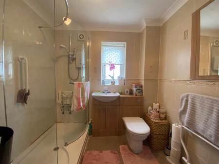 Fitted with 3 piece suite having walk in shower cubicle with curved, glazed screen and electric shower, concealed cistern, low level push button W.C. and vanity unit wash hand basin with mixer tap over and cupboards below. Extractor fan, modesty glazed uPvc window to front elevation. Laminate flooring. Wetboarding and tiling to walls. Heated towel rail.