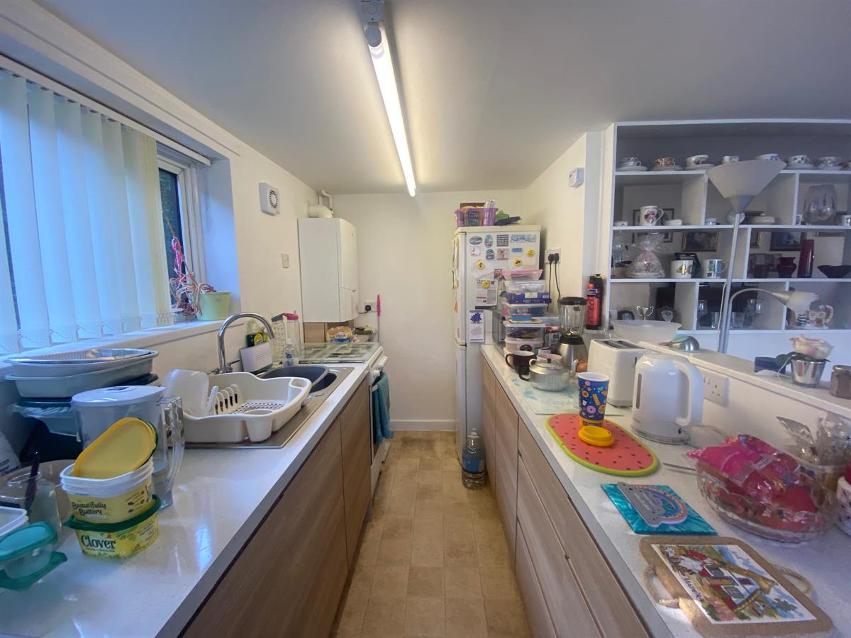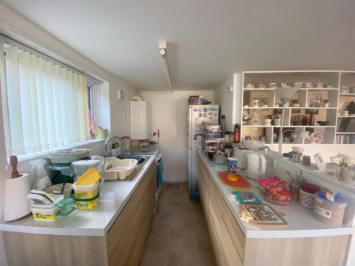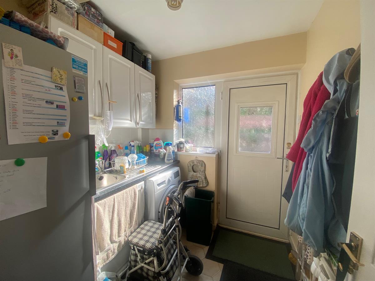 Having a uPvc double glazed frosted panelled door leading out to the rear, uPvc double glazed panelled window, tiled flooring, work station with a stainless single drainer sink unit with mixer tap and storage cupboard below, space for a washer, space for fridge freezer.