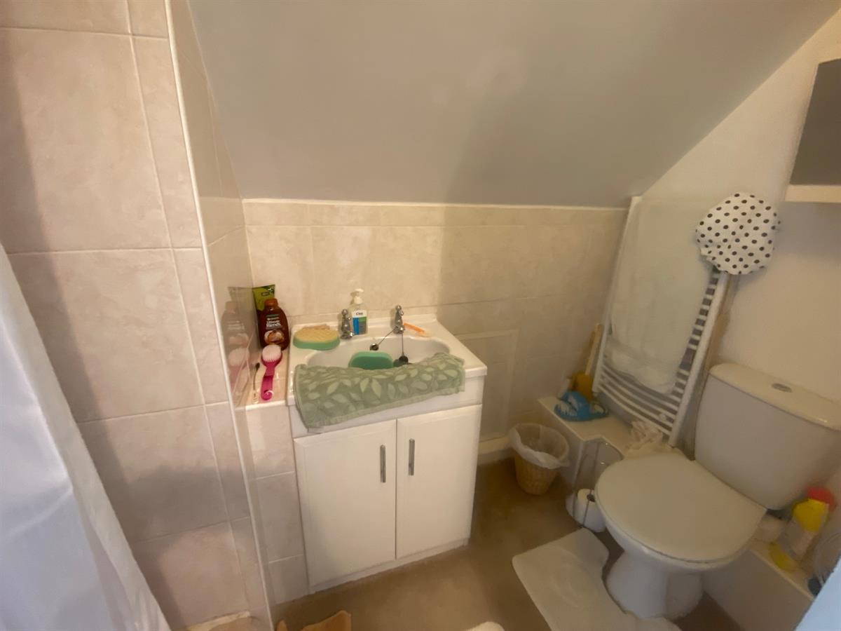 Having a three piece suite comprising of a push button low level WC, vanity unit wash hand basin with storage cupboards below, shower cubicle housing a electric shower.
