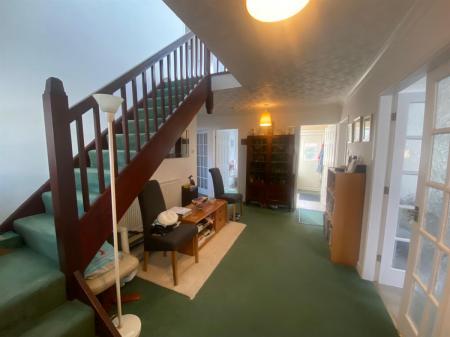 Really spacious reception / dining hall with stairs rising to the first floor, uPvc double glazed panelled window to the front elevation, two double panelled radiators, doors to all further rooms and glazed double doors leading into the sitting room.