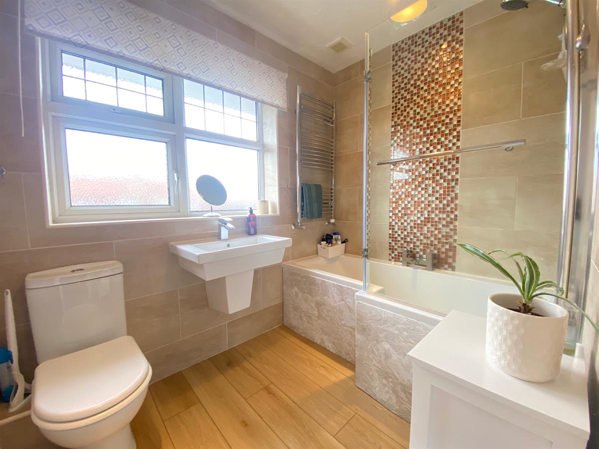 Lovely family bathroom with a uPvc double glazed frosted panelled window to the rear elevation, inset spot lighting, LVT flooring, three piece suite comprising of a push button low level WC, wall mounted wash hand basin with mixer tap, P-shaped double ended panelled bath with mixer tap and electric shower over and glazed shower screen, heated towel rail finished in chrome, complimentary wall tiling where visible.