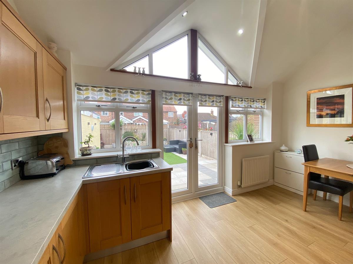 fantastic kitchen / family room having oak effect LVT flooring throughout, two single panelled radiators, uPvc double glazed panelled windows to the rear elevation, uPvc double glazed panelled double doors leading out to the rear garden. The kitchen is fitted with a range of wall, base and drawer units granite effect work surfaces over incorporating a stainless steel single drainer sink unit with mixer tap and complimentary splash back tiling, built in four ring gas hob with electric oven below, central island with storage drawer and cupboard space, integrated fridge, integrated freezer, under counter lighting, door leading into the utility / cloakroom.