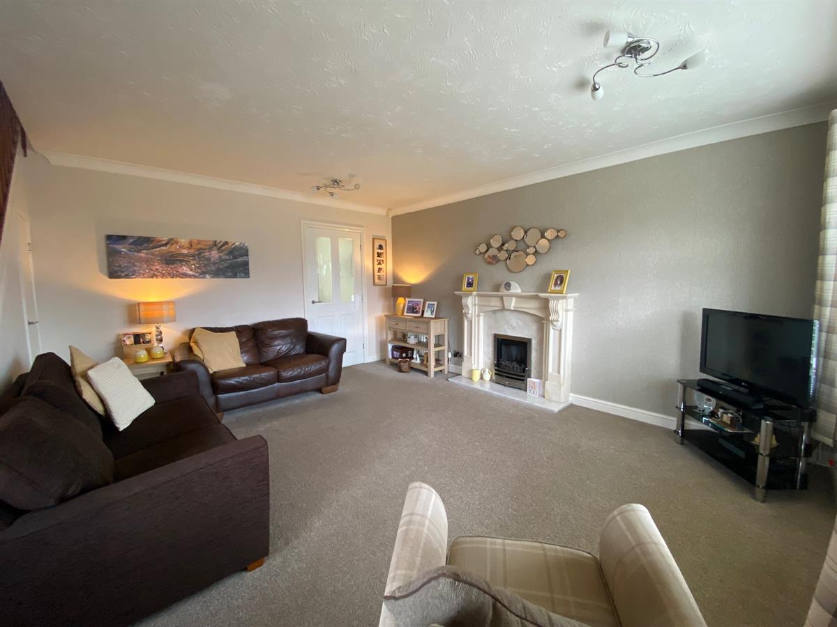 Spacious living room with a uPvc double glazed panelled bay window to the front elevation, uPvc double glazed panelled frosted window to the side elevation, two double panelled radiators, under stairs storage cupboard, feature fire surround with marble effect slips and hearth housing a coal effect living flame gas fire with chrome surround, glazed panelled door leading into the kitchen / family room.