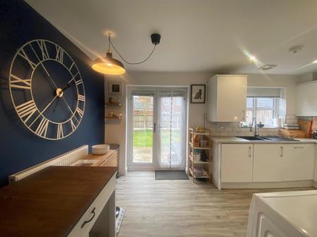 Having inset spot lighting, uPvc double glazed panelled window to the rear elevation, uPvc double glazed panelled doors leading to the rear garden, double panelled radiator. The kitchen is fitted with a range of wall, base and drawer units with granite effect roll top work surfaces over incorporating a one and a half bowl resin sink unit with mixer tap and complimentary splash back tiling, built in four ring gas hob with extractor hood over and built in eye level electric oven, integrated fridge, integrated freezer, integrated dish washer, integrated washer, wall mounted central heating boiler concealed with the kitchen unit, space for table and chairs.