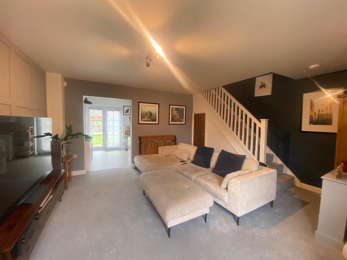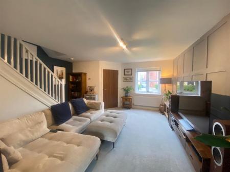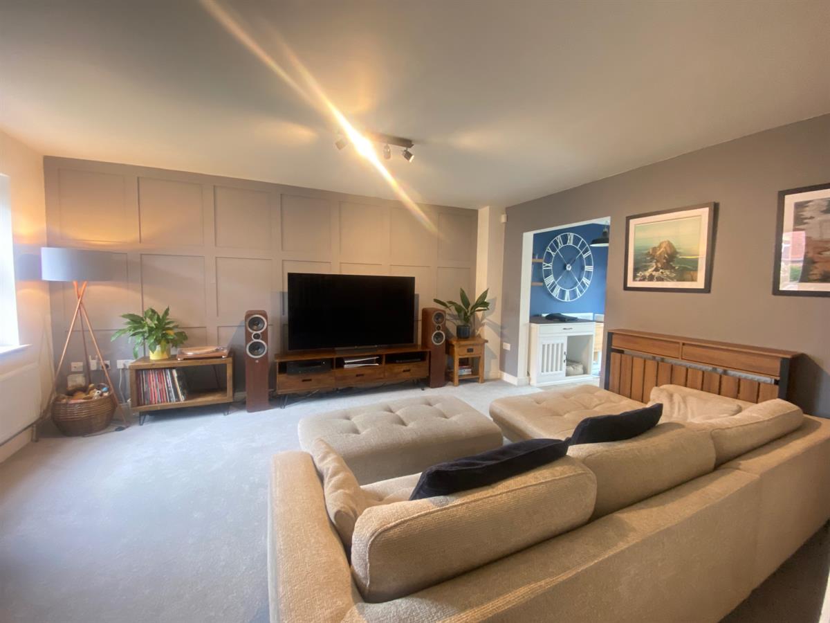 Really spacious living room having uPvc double glazed panelled window to the front elevation, two double panelled radiators, stairs rising to the first floor, under stair storage cupboard, feature panelled wall, opening into the dining kitchen.