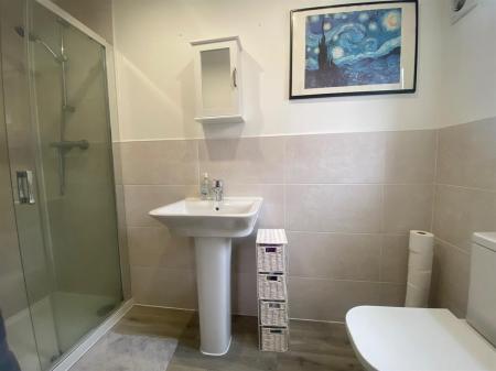 Having a uPvc double glazed panelled frosted window to the side elevation, double panelled radiator, three piece suite comprising of a push button low level WC, pedestal wash hand basin with mixer tap, walk in shower cubicle with glazed sliding door housing a mixer shower, inset spot lighting, complimentary wall tiling.
