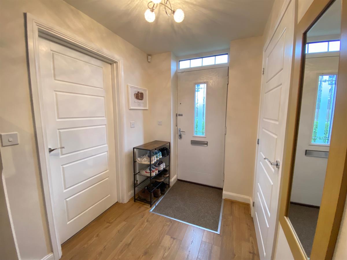 Spacious reception hall having oak effect flooring, stairs rising to the first floor, built in storage cupboard, doors to all further rooms.