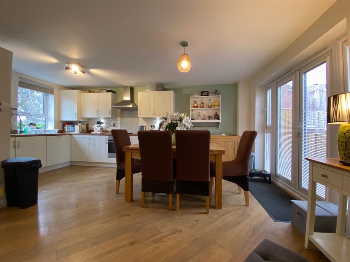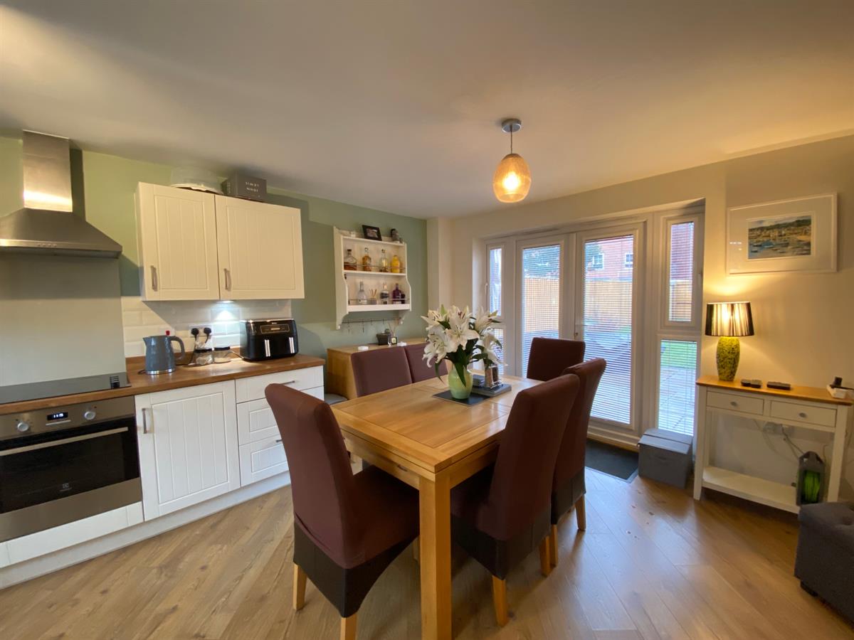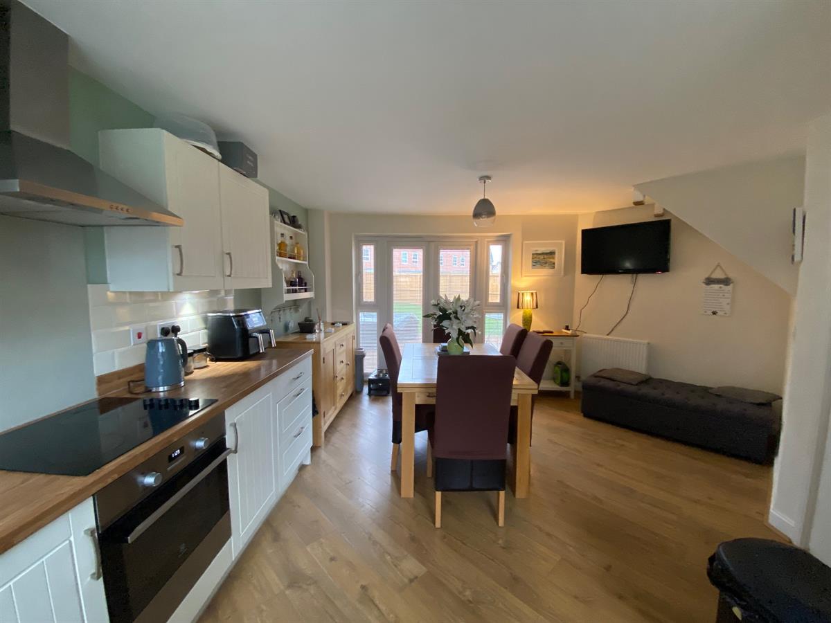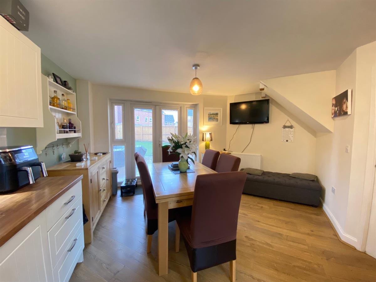 Really spacious dining kitchen with two uPvc double glazed panelled Georgian bar windows to the front elevation, uPvc double glazed panelled doors leading out to the rear elevation, double panelled radiator, oak effect flooring throughout continued through from the reception hall. The kitchen is fitted with a range of wall, base and drawer units with roll top work surfaces over incorporating one and a half bowl stainless steel single drainer sink unit with mixer tap, built in four ring electric hob with extractor hood over and built in electric oven below, integrated fridge, integrated freezer, integrated dishwasher, integrated washer, under counter lighting, complimentary wall tiling, space for table and chairs.