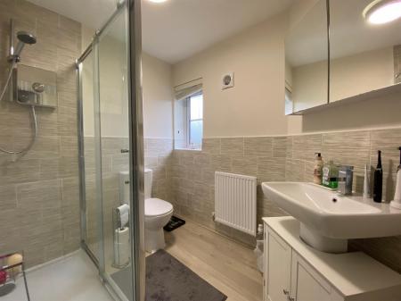 En-suite shower room with a uPvc double glazed frosted panelled window to the side elevation, single panelled radiator. Fitted with a three piece suite comprising of a push button low level WC, pedestal wash hand basin with mixer tap, walk in shower cubicle with glazed sliding door housing an electric shower, laminate flooring, complimentary wall tiling, wall mounted shaver socket.